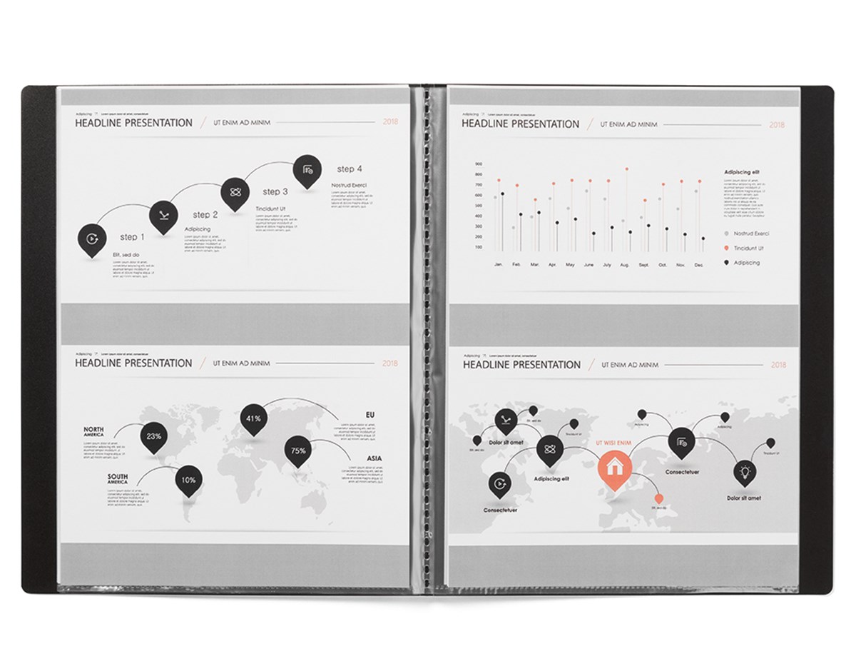 Demonstrations- och presentationspärm i polypropylen med fastsvetsade kopiesäkra fickor för A4. Istoppsficka på framsida och rygg för egen framsida och uppmärkning av ryggen. Svart.