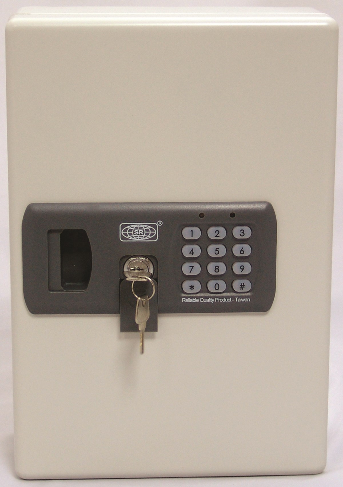 Skåp av kraftig stålplåt med digitalt lås och LED-indikator. Levereras med nyckelbrickor och 2 huvudnycklar. Justerbara krokar. Möjlighet till inmatning av egen kod. För drift av lås behövs 4 st AA-batterier (ingår ej).