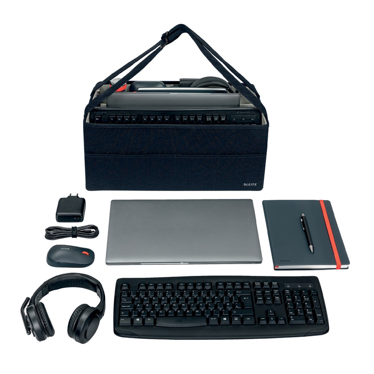 Leitz Office-In-A-Bag-väska i tyg har tre separata fack där du kan förvara och bära med dig allt du behöver för dagen du har framför dig. En modern och praktisk förvaringsväska som har tillräckligt med utrymme för laptop, tangentbord, mus, laddare, headset, anteckningsbok och en vattenflaska. Den får plats i alla skåp i standardstorlek och passar också utmärkt som lärarväska. Tillverkad av mjukt material som är förstärkt med återvunnen kartong för styrka och hållbarhet. Totalt 57% återvunnet material. Namnetiketten som medföljer väskan gör att du enkelt kan identifiera den i delade utrymmen.