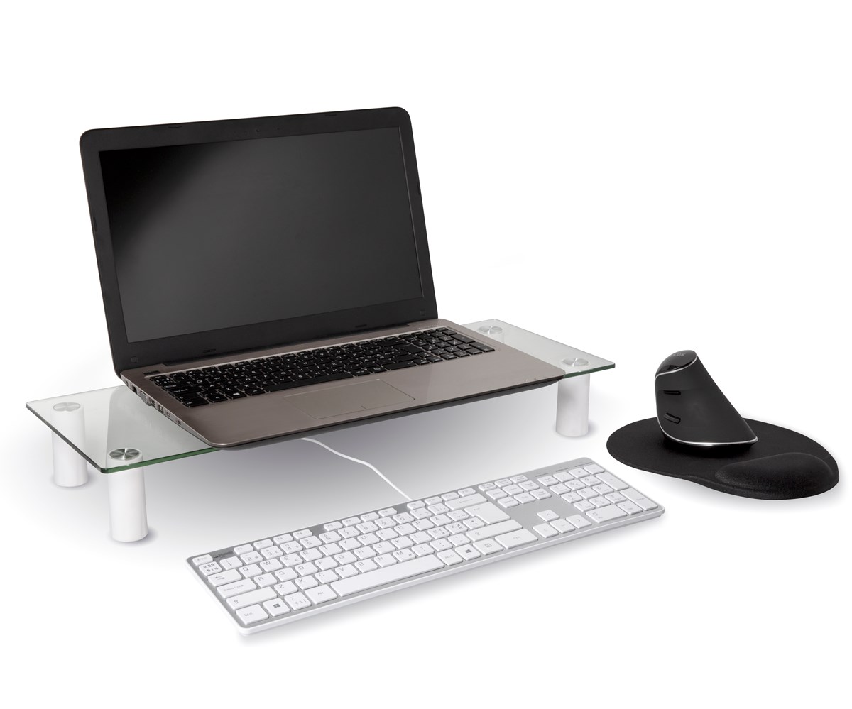 Att ha skärmen placerad i ögonhöjd förebygger stelhet och smärta eftersom du inte behöver arbeta med nacken böjd framåt. Stödet kan justeras i två olika höjder. För förbättrad ergonomi, överväg att använda ett separat tangentbord om du arbetar vid en laptop. Passar till både bärbara datorer och bildskärmar. Material: glas, plast och aluminium. Mått: 580 x 210 x 80/130 mm.