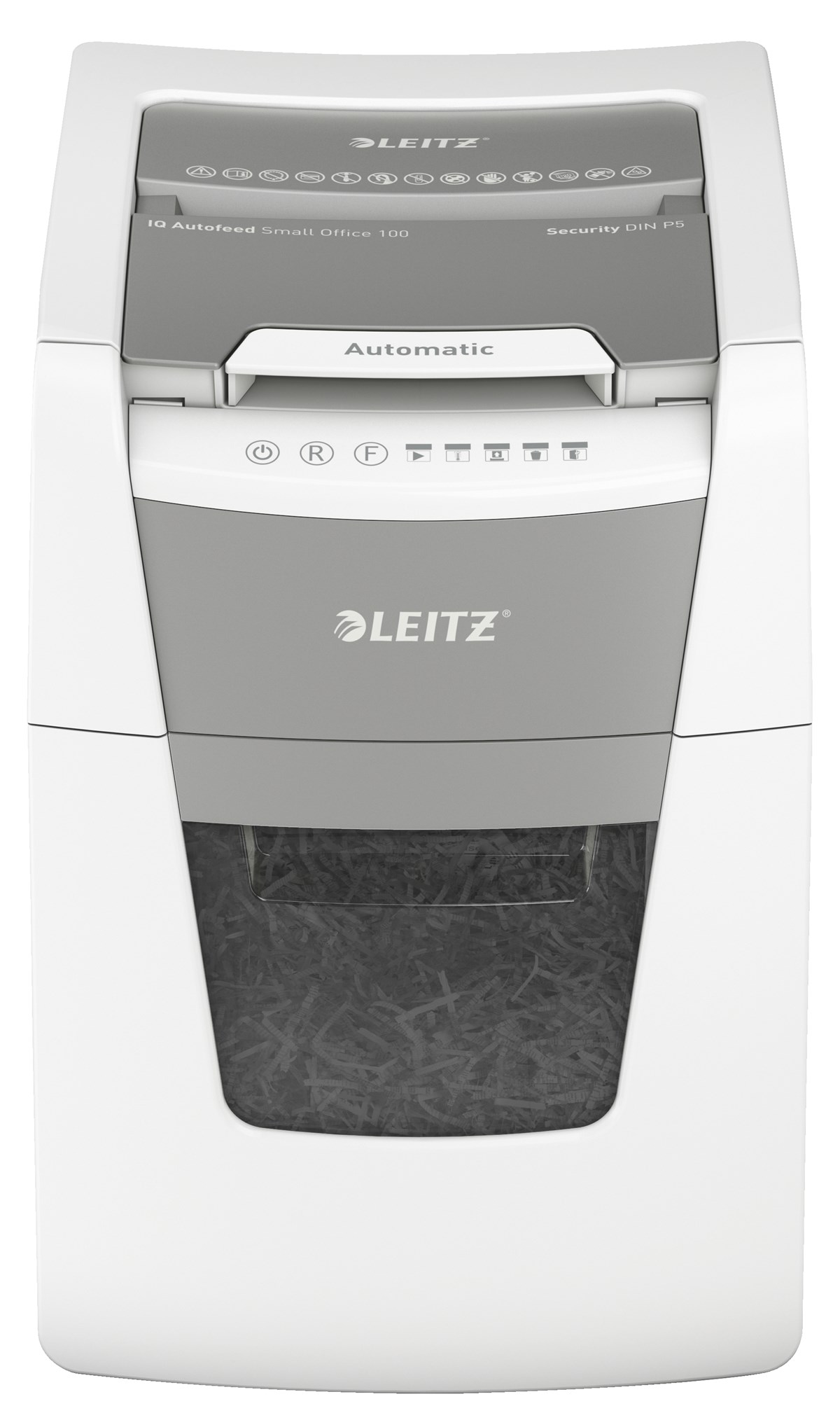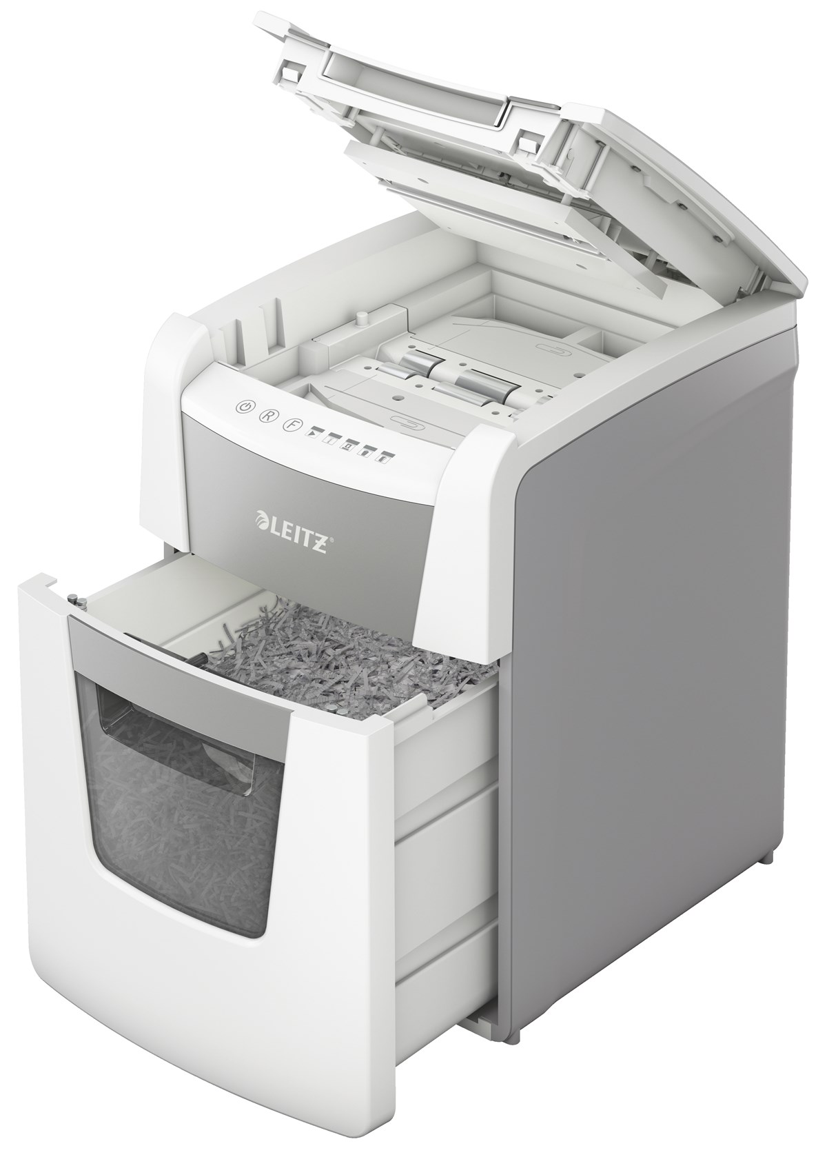 Automatisk makulering av upp till 100 A4-ark, fack för manuell arkmatning. Säkerhetsklass P5 (2x15 mm) destruerar smidigt känslig data, även personuppgifter. AntiJam. Tyst drift upp till 20 minuter, 55 dBA. Viloläge efter 3 minuters inaktivitet. Varning när 20% av behållarkapacitet kvar. Strimlar häftklammer, gem och plastkort. Mått: 365 x 530 x 430 mm. Garanti 2 + 1 år. Vi rekommenderar att man använder oljeark var tredje gång man tömmer dokumentförstörarens avfallsbehållare.