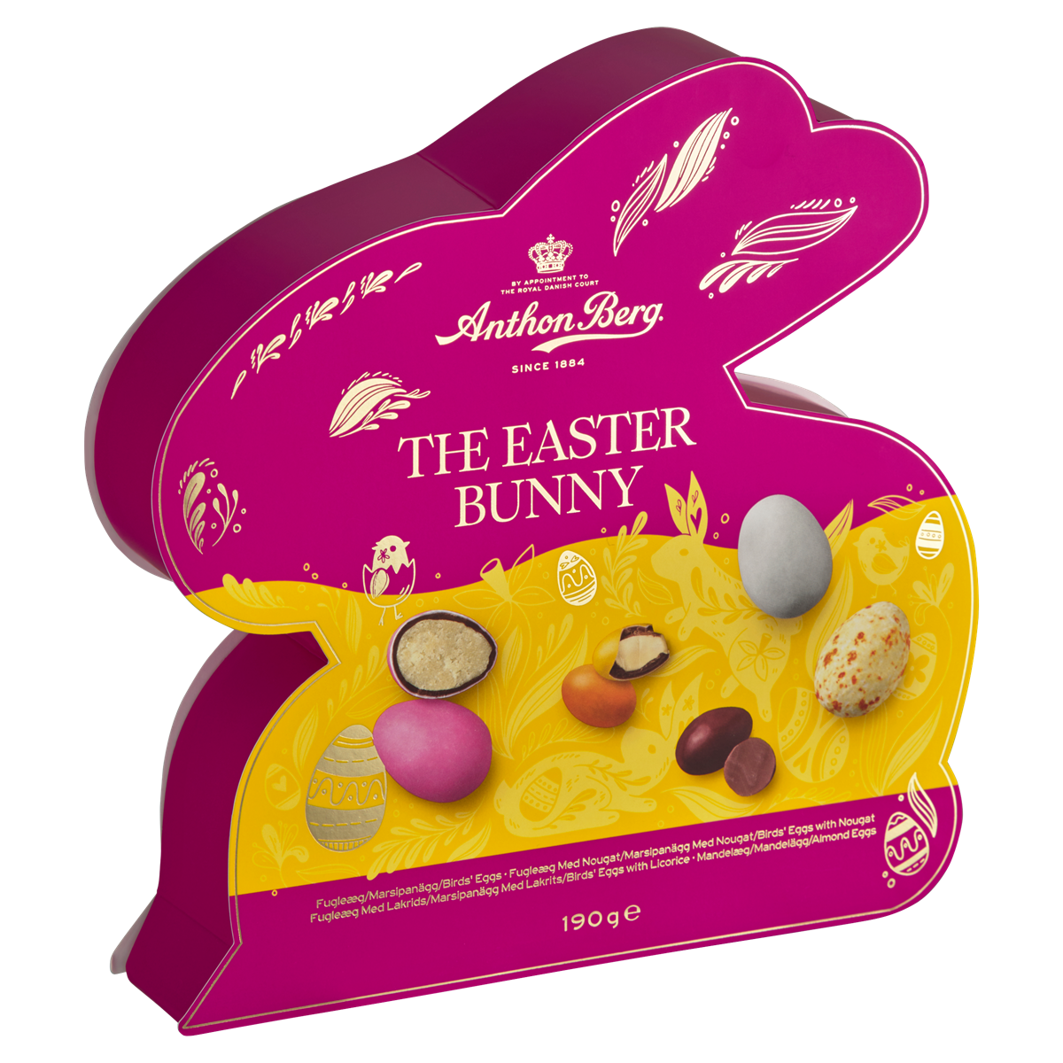 Gåvoask formad som en påskhare innehållande ett urval av Anthon Bergs välkända påskklassiker: mandelägg, chokladägg och fågelägg i varianterna marsipan, nougat och lakrits. Asken är den idealiska gåvan till påskmiddagen.