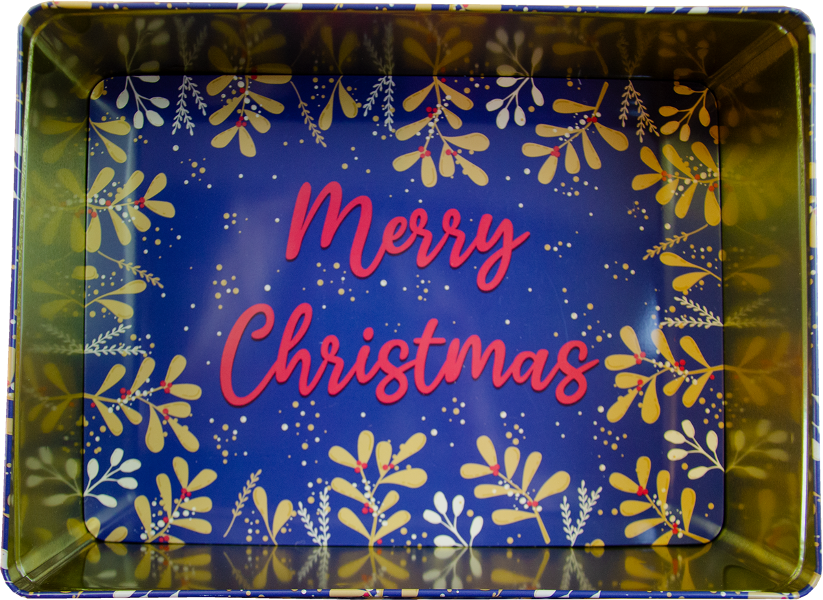 Julig dekorativ plåtlåda med ett fönster som visar det goda innehållet. När det goda tar slut finns där en trevlig julhälsning i botten.