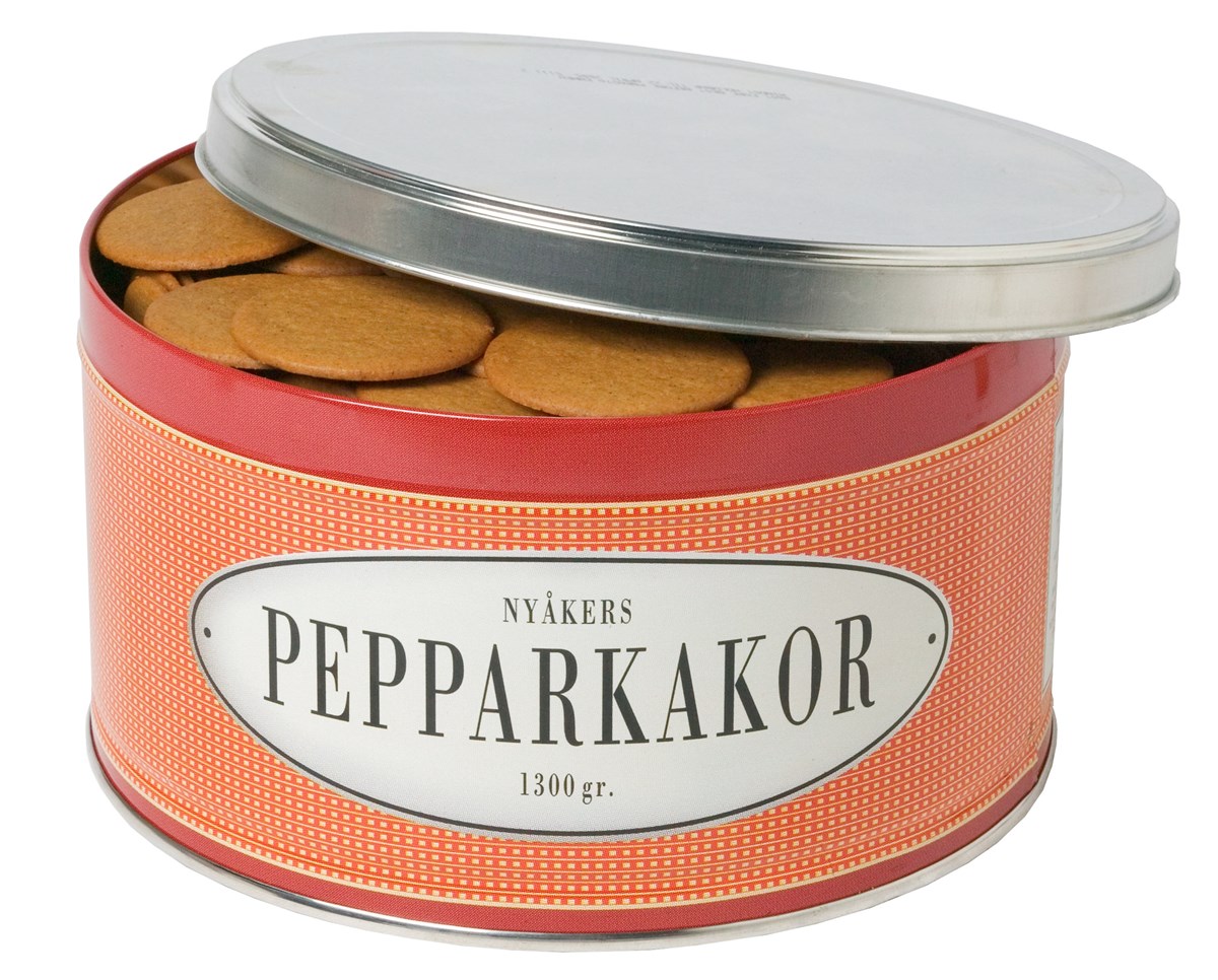 Pepparkakor från Nyåkers bakat på recept från 1952. Spröda och goda förpackade i vacker plåtburk. Vikt 1300 gram.