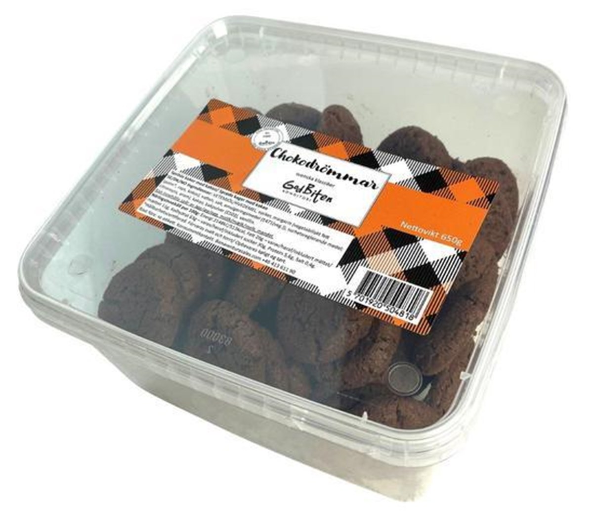 Goda småkakor förpackade i förslutningsbar plastburk. Vikt 650 g.