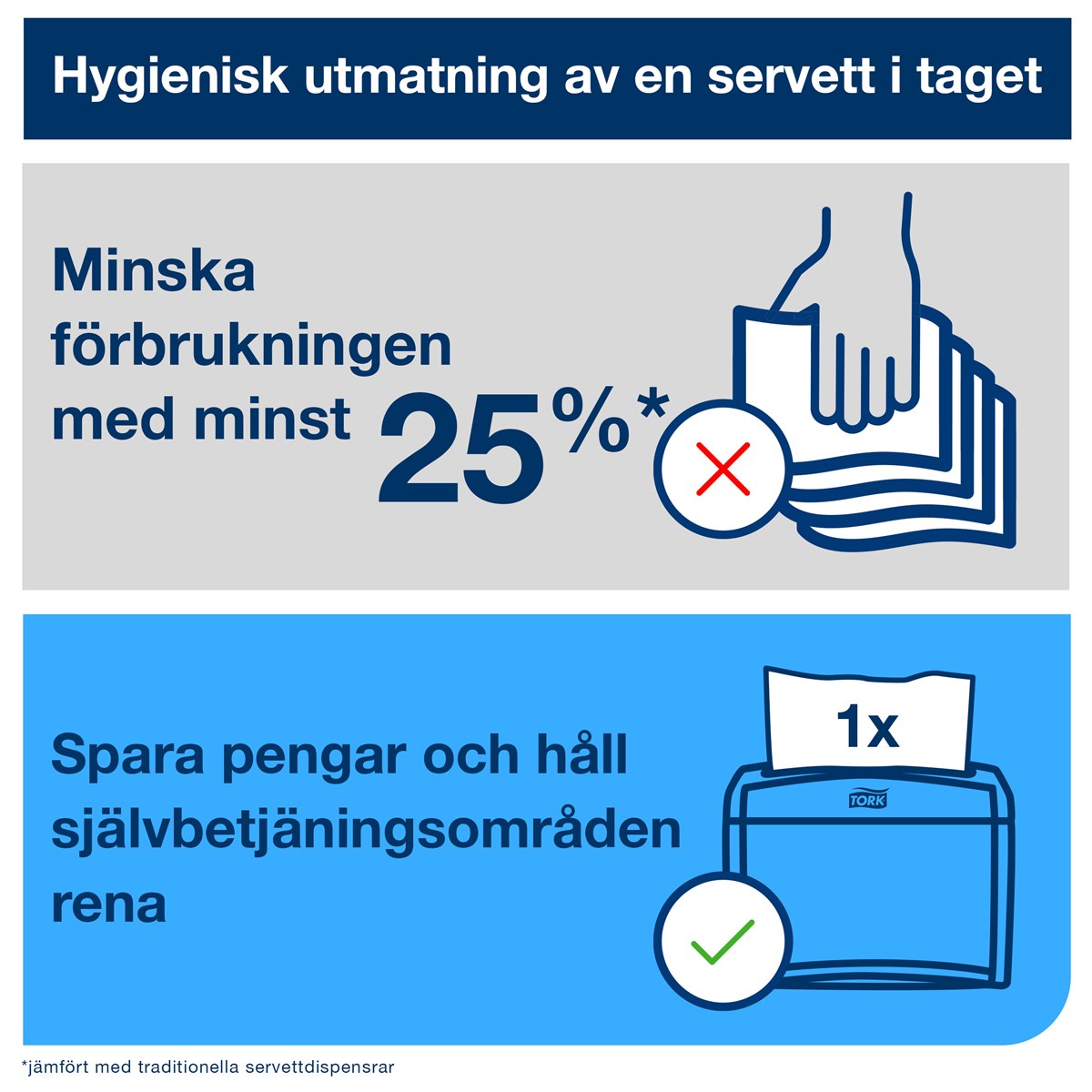 1-lagers servetter, större ovikta Inga blekmedel eller färgämnen Unik förpackning som skyddar buntarna vid förvaring och hantering Kontrollera förbrukning och kostnader med utmatning av en servett i taget Komposterbara (EN13432) och tillverkade av 100 % återvunna fibrer