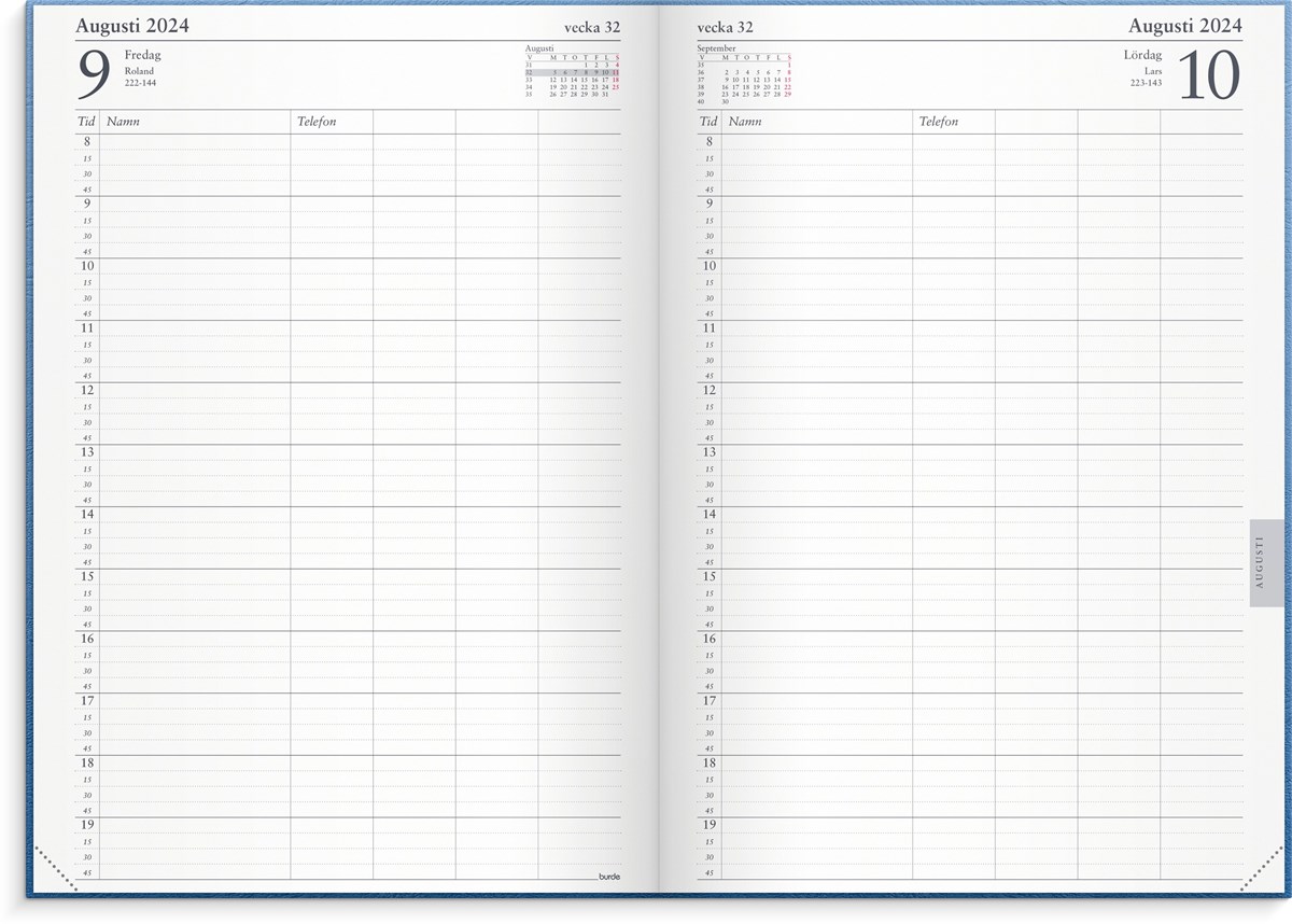 Format: 180x265 mm. Layout: Dag/Sida. Kvartsindelning 8-20. Kalendarium: 2024-01-01 - 2024-12-31. Omslag: Kartong. Inbunden. Detaljer: Märkband. Innehåll: Fem kolumner varav tre fria, årsöversikter, årsplan. Antal sidor: 368. Miljöinformation: FSC.