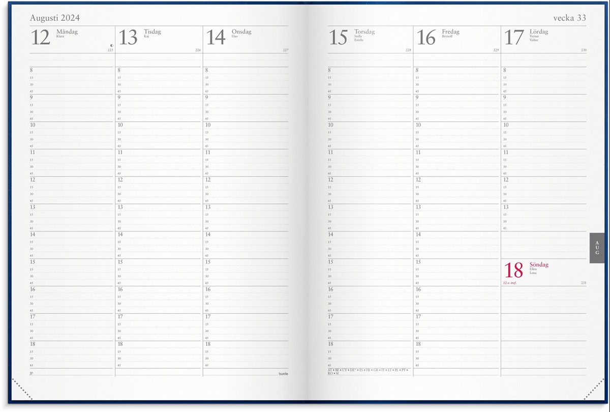 Format: 195x260 mm. Layout: Stående. Vecka/Uppslag. Kvartsindelning 8-19. Kalendarium: 2023-12-26 - 2024-12-31. Omslag: Konstläder. Inbunden. Detaljer: Märkband. Innehåll: Årsöversikter, årsplaner, internationella helgdagar. Antal sidor: 112. Miljöinformation: FSC.