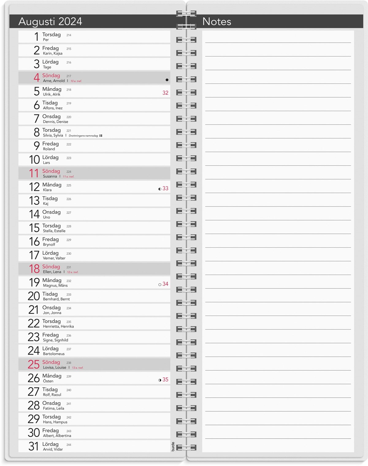 Kalender 2024 från Burde. Format: 115x295 mm. Layout: Månad/Blad. Kalendarium: 2024-01-01 - 2024-12-31. Omslag: PP-plast. Spiralbunden. Innehåll: Årsöversikter, linjerade högersidor. Antal sidor: 25. Miljöinformation: FSC.
