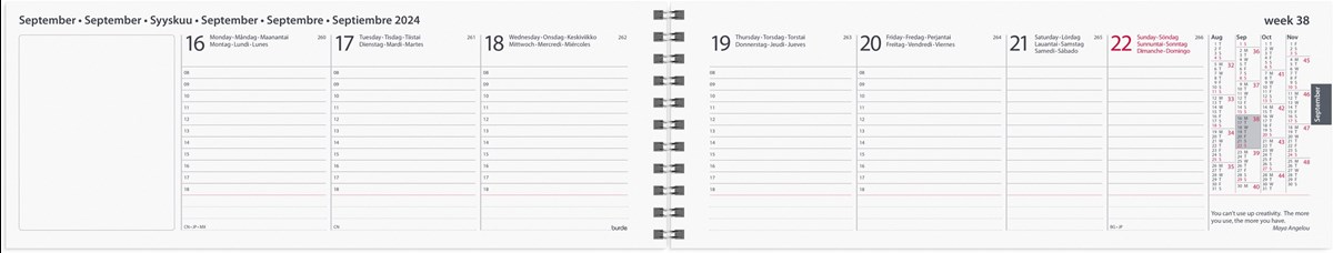 Kalender 2024 från Burde. Format: 255x95 mm. Layout: Stående. Vecka/Uppslag. Timindelning 8-18. Kalendarium: 2023-12-25 - 2025-01-05. Omslag: Papper. Spiralbunden. Innehåll: Årsöversikter, årsplaner, internationella helgdagar, 6-språkig. Antal sidor: 120. Miljöinformation: FSC.