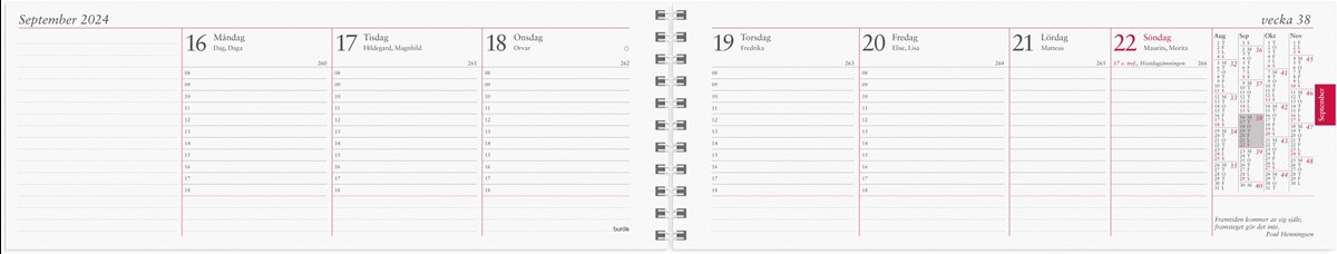 Kalender 2024 från Burde. Format: 255x95 mm. Layout: Stående. Vecka/Uppslag. Timindelning 8-18. Kalendarium: 2023-12-25 - 2025-01-05. Omslag: Papper. Spiralbunden. Innehåll: Årsöversikter, årsplaner. Antal sidor: 120. Miljöinformation: FSC.