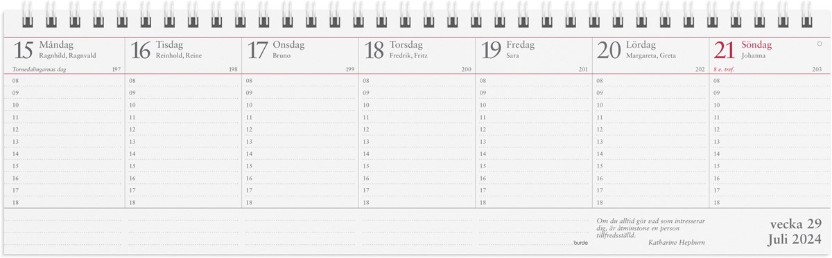Kalender 2024 från Burde. Format: 305x90 mm. Layout: Stående. Vecka/Uppslag. Timindelning 8-18. Kalendarium: 2023-12-25 - 2025-01-05. Omslag: Kartong. Spiralbunden. Innehåll: Årsöversikter. Antal sidor: 56. Miljöinformation: FSC.