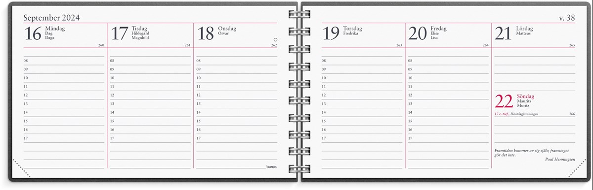 Kalender 2024 från Burde. Format: 148x90 mm. Layout: Stående. Vecka/Uppslag. Timindelning 8-17. Kalendarium: 2023-12-18 - 2025-01-05. Omslag: Återvunnen kartong. Spiralbunden. Innehåll: Årsöversikter, årsplaner, inbundet telefonregister. Antal sidor: 144. Miljöinformation: FSC. Omslag i återvunnen kartong.