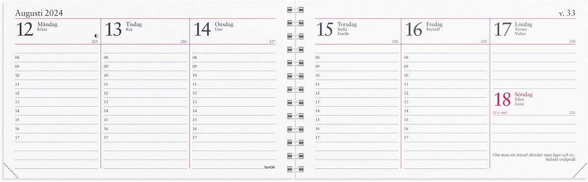Kalender 2024 från Burde. Format: 148x90 mm. Layout: Stående. Vecka/Uppslag. Timindelning 8-17. Kalendarium: 2023-12-18 - 2025-01-05. Omslag: Kartong. Spiralbunden. Innehåll: Årsöversikter, årsplaner. Antal sidor: 128. Miljöinformation: FSC.