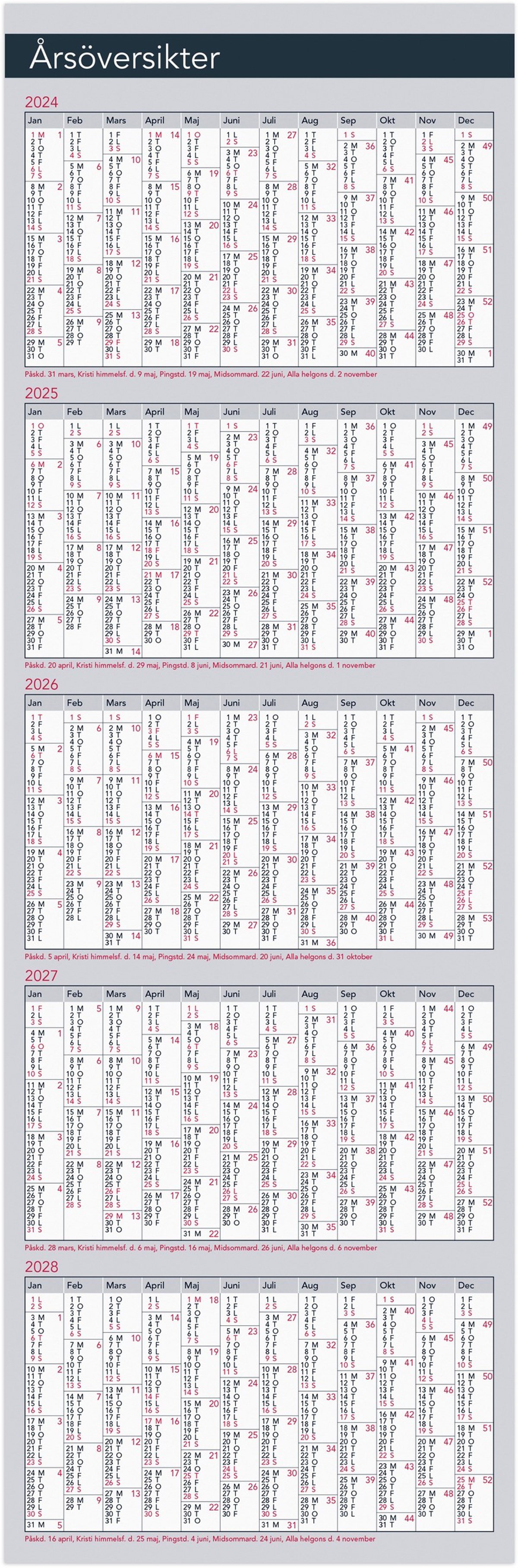 Kalender 2025 från Burde. Format: 120x366 mm. Layout: År/blad. Kalendarium: 2025-01-01 - 2025-12-31. Innehåll: Namnsdagar, årsöversikter för föregående, innevarande och de tre följande åren. Antal sidor: 2. Miljöinformation: FSC®.