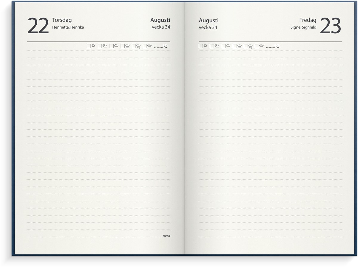 Kalender 2024 från Burde. Format: 142x205 mm. Layout: Dag/Sida. Kalendarium: 2024-01-01 - 2024-12-31. Omslag: Konstläder. Inbunden. Detaljer: Märkband. Innehåll: Årsöversikter, årsplan, namnsdagsregister, vädernoteringar. Antal sidor: 384. Miljöinformation: FSC papper.