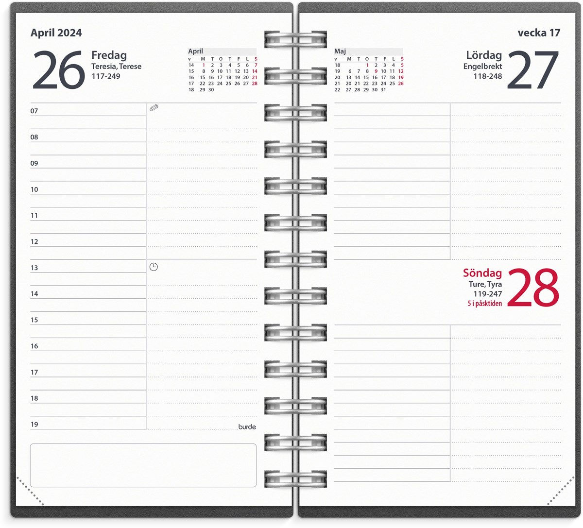 Kalender 2024 från Burde. Format: 95x170 mm. Layout: Dag/Sida. Timindelning 7-19. Kalendarium: 2023-12-25 - 2025-01-05. Omslag: Återvunnen kartong. Spiralbunden. Innehåll: Årsplaner. Antal sidor: 352. Miljöinformation: FSC. Omslag i återvunnen kartong. Tillverkad i Småland.