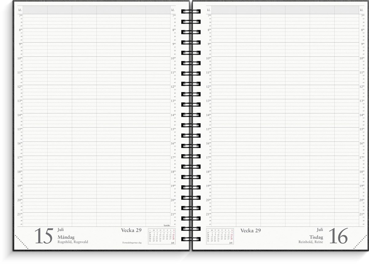 Kalender 2024 från Burde. Format: A4. Layout: Dag/Sida. Kvartsindelning 07-21. Kalendarium: 2024-01-01 - 2024-12-31. Omslag: Kartong. Spiralbunden. Innehåll: Årsöversikter, årsplaner, månadsöversikt på varje sida och sex fria kolumner. Antal sidor: 384. Miljöinformation: FSC.