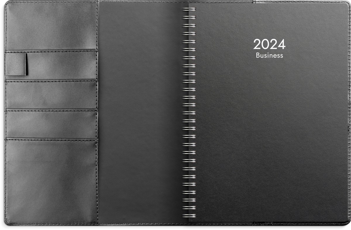 Kalender 2024 från Burde. Format: A5. Layout: Stående. Vecka/Uppslag. Timindelning 8-18. Kalendarium: 2023-11-27 - 2025-01-05. Omslag: Konstläder. Spiralbunden. Innehåll: Årsöversikter, årsplaner, internationella helgdagar. Antal sidor: 128. Miljöinformation: FSC papper.