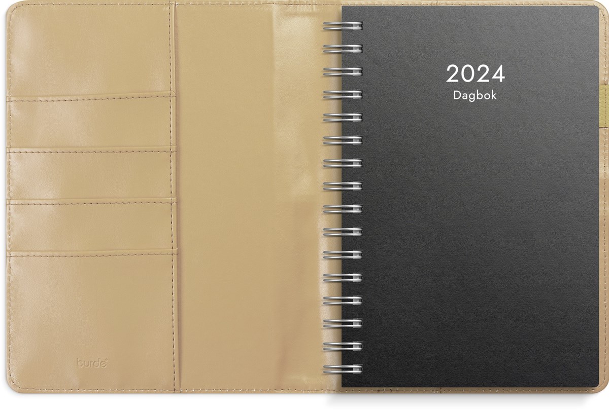 Kalender 2024 från Burde. Format: 135x205 mm. Layout: Dag/Sida. Timindelning 8-19. Kalendarium: 2024-01-01 - 2024-12-31. Omslag: Konstläder. Spiralbunden. Innehåll: Årsplaner, urstansat månadsregister. Antal sidor: 400. Miljöinformation: FSC papper.