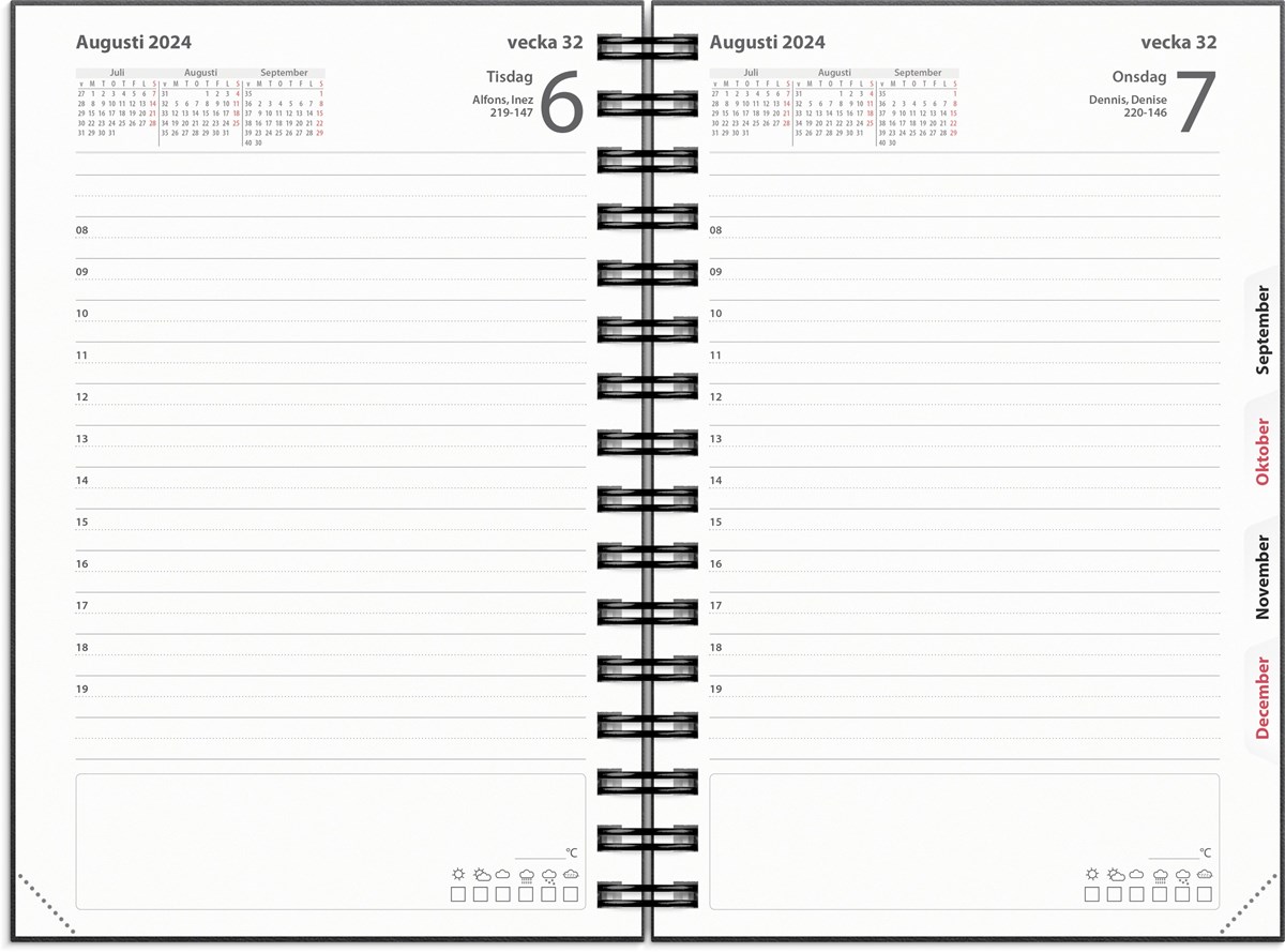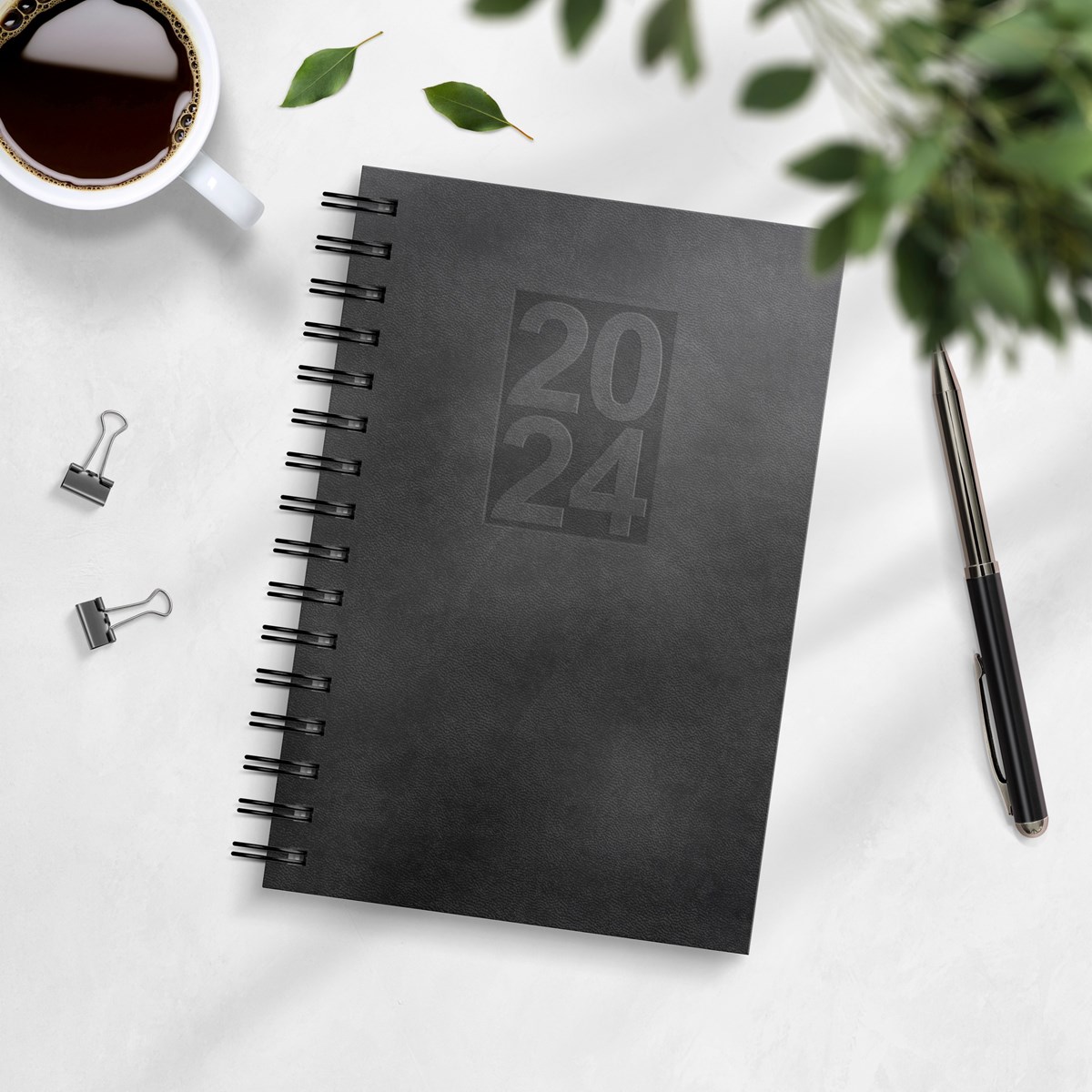 Kalender 2024 från Burde. Format: 135x205 mm. Layout: Dag/Sida. Timindelning 8-19. Kalendarium: 2024-01-01 - 2024-12-31. Omslag: Konstläder. Spiralbunden. Innehåll: Årsplaner, urstansat månadsregister. Antal sidor: 400. Miljöinformation: FSC.