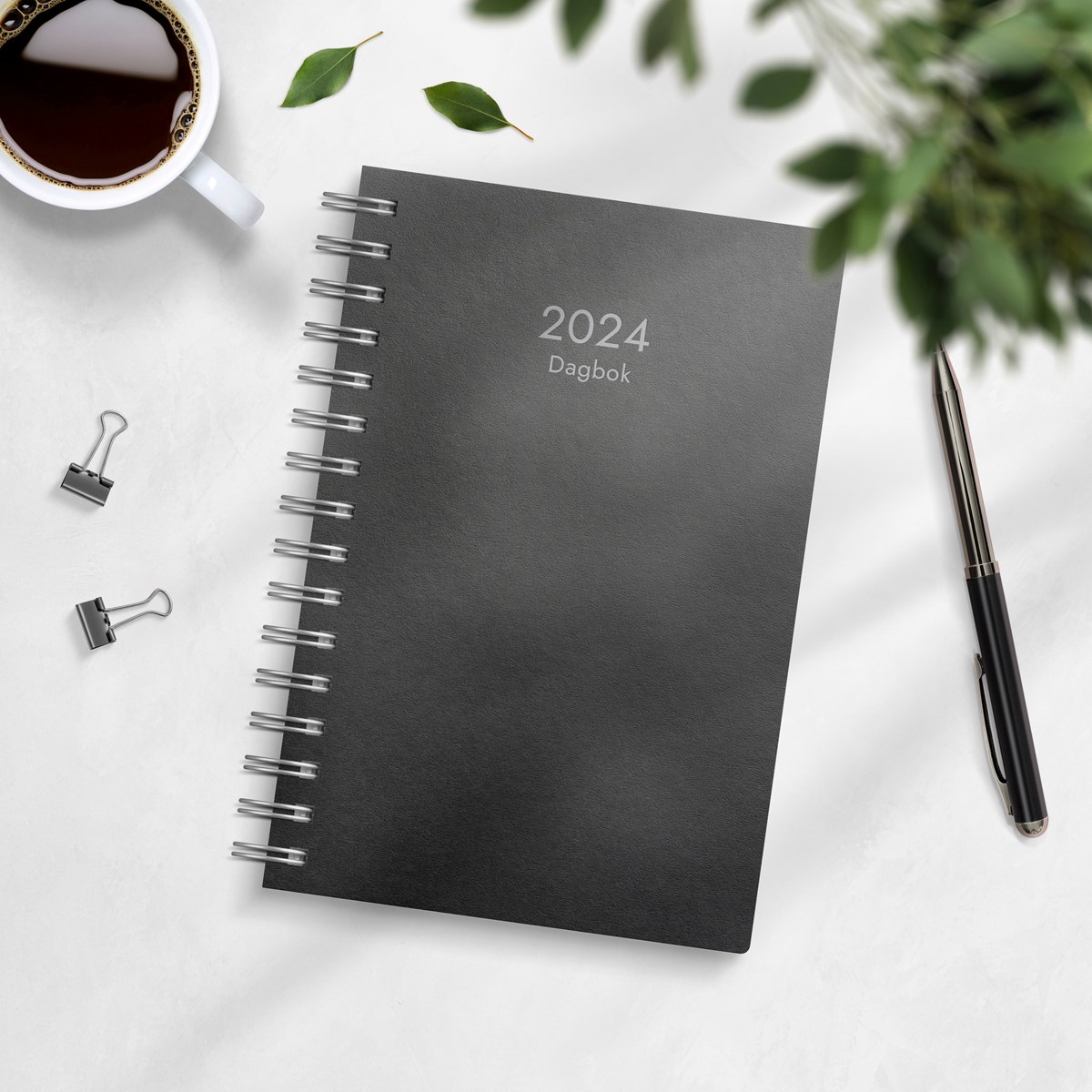 Kalender 2024 från Burde. Format: 135x205 mm. Layout: Dag/Sida. Timindelning 8-19. Kalendarium: 2024-01-01 - 2024-12-31. Omslag: Återvunnen kartong. Spiralbunden. Innehåll: Årsplaner, urstansat månadsregister. Antal sidor: 400. Miljöinformation: FSC. Omslag i återvunnen kartong. Tillverkad i Småland.