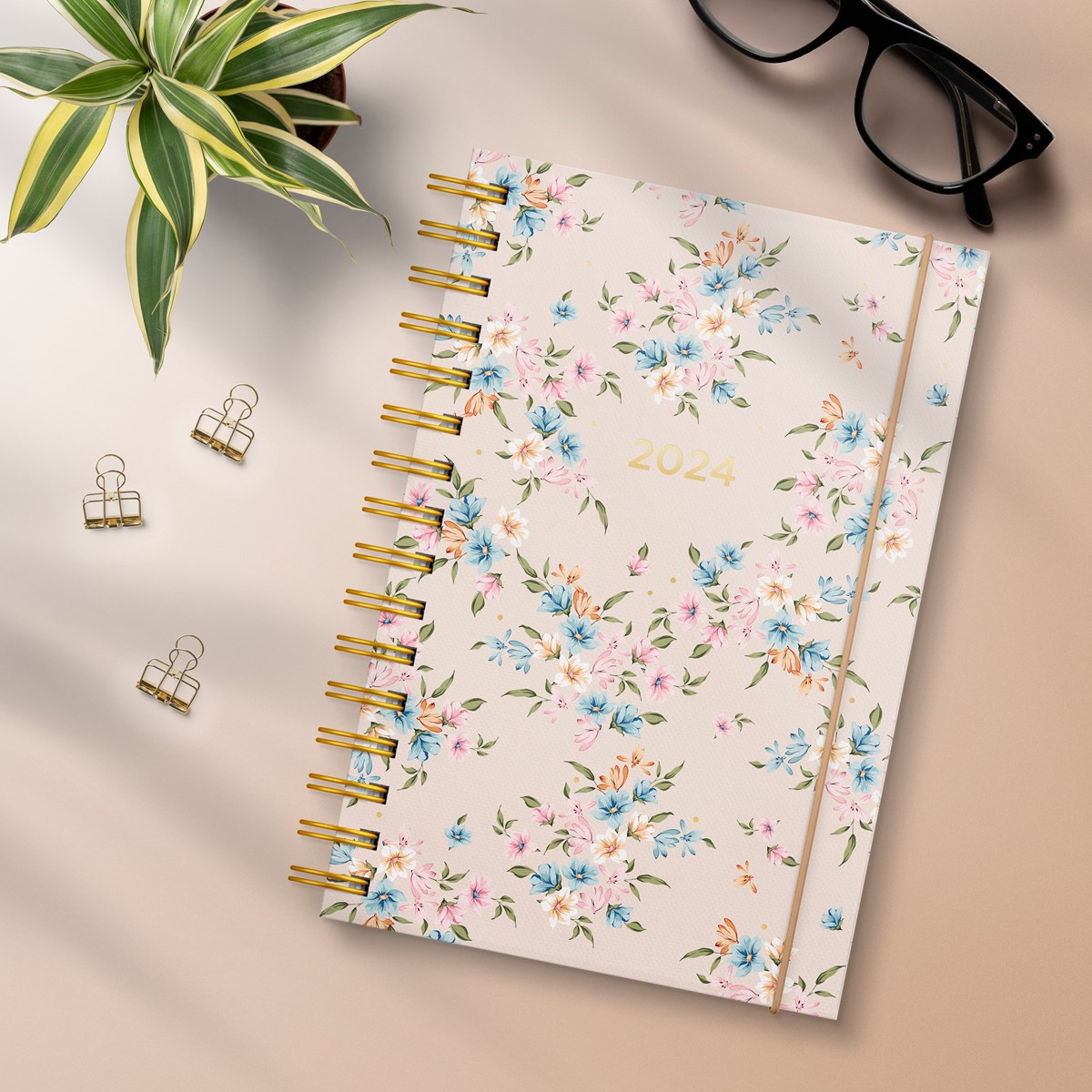 Kalender 2024 från Burde. Format: 135x205 mm. Layout: Dag/Sida. Timindelning 8-19. Kalendarium: 2024-01-01 - 2024-12-31. Omslag: Kartong. Spiralbunden. Detaljer: Gummiband. Innehåll: Årsplaner, urstansat månadsregister. Antal sidor: 400. Miljöinformation: FSC.