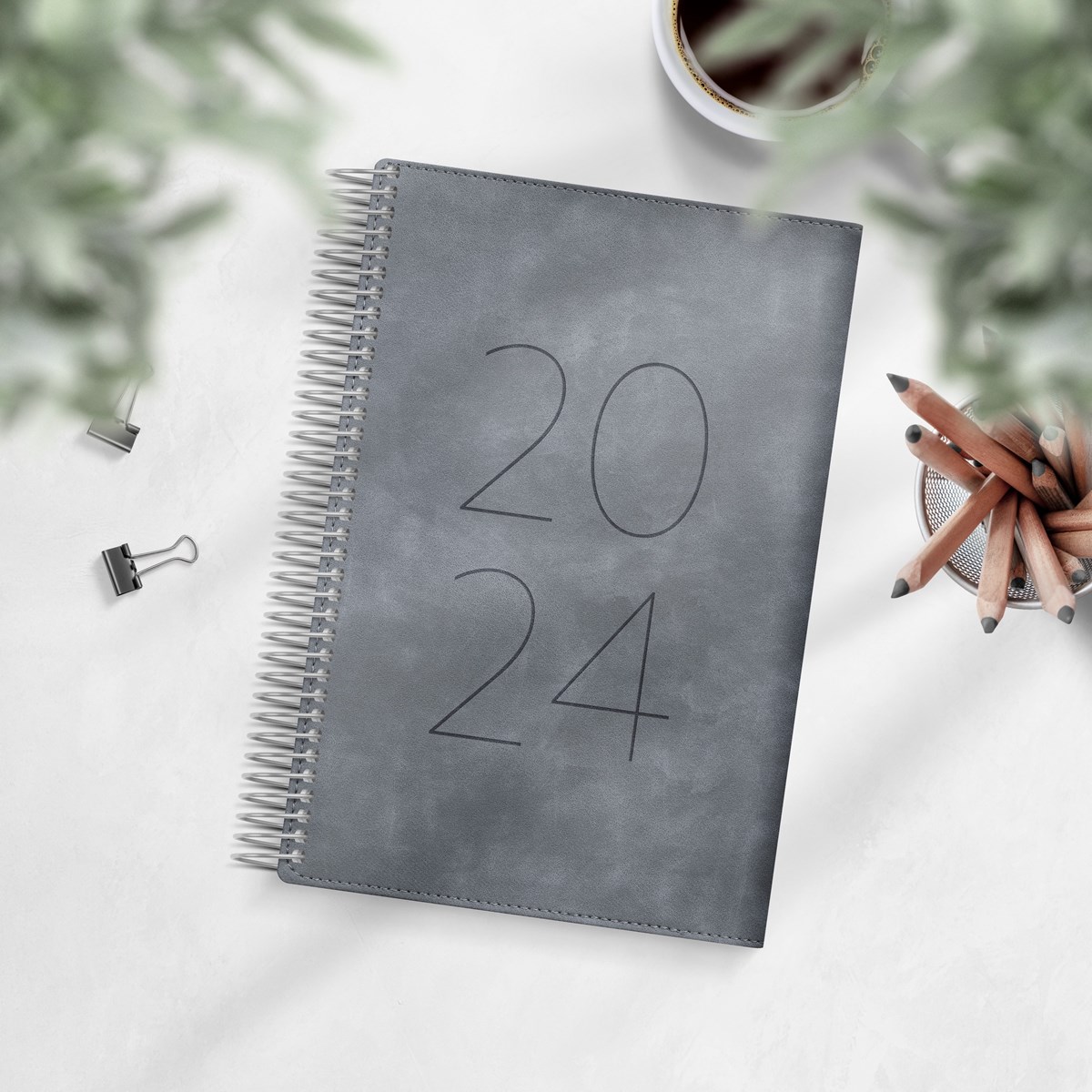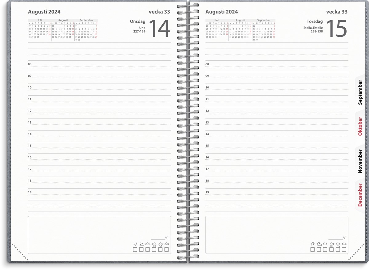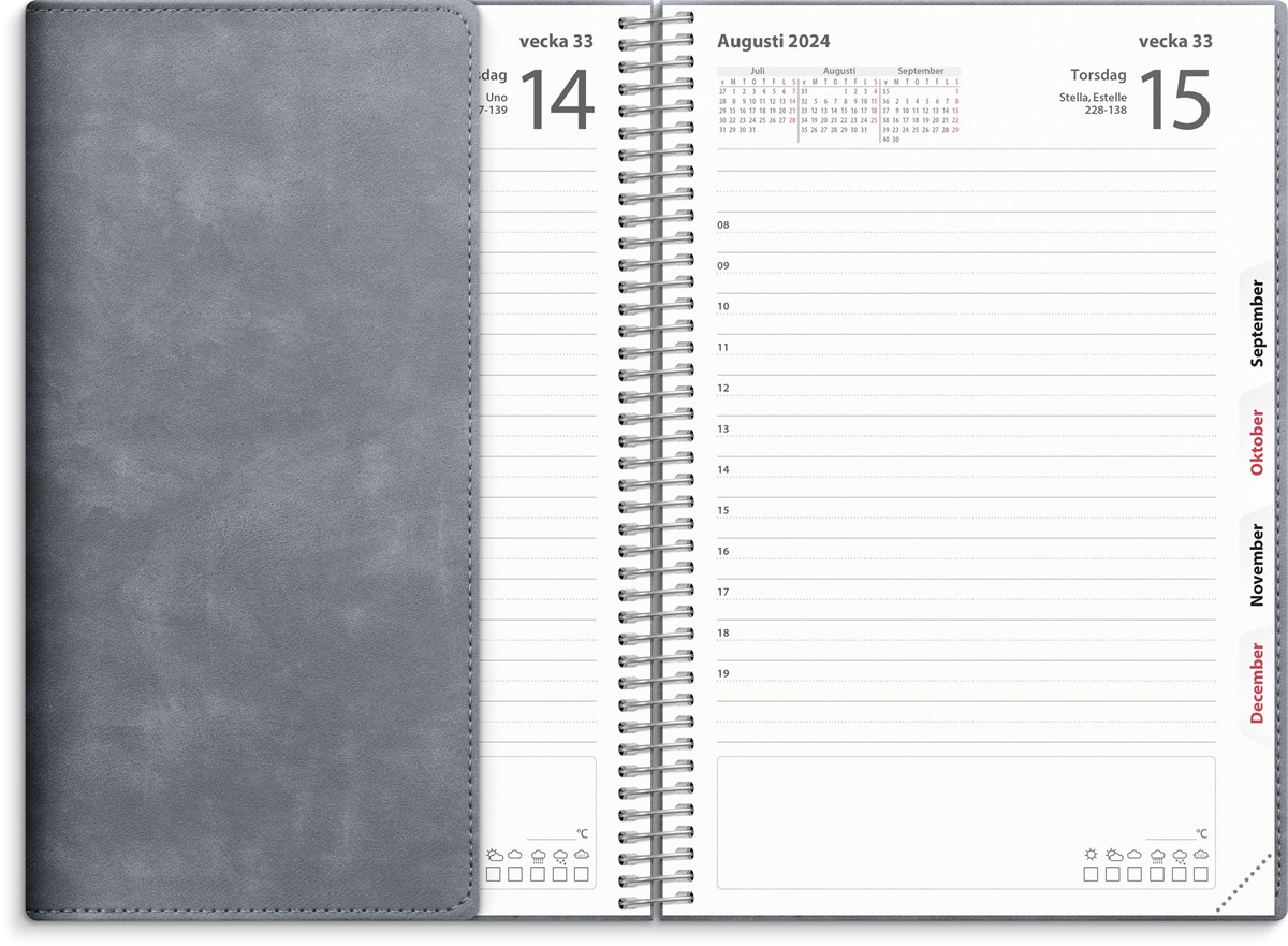 Kalender 2024 från Burde. Format: 135x205 mm. Layout: Dag/Sida. Timindelning 8-19. Kalendarium: 2024-01-01 - 2024-12-31. Omslag: Konstläder. Spiralbunden. Innehåll: Årsplaner, urstansat månadsregister. Antal sidor: 400. Miljöinformation: FSC papper.
