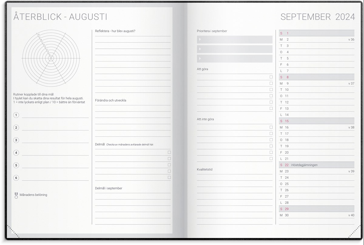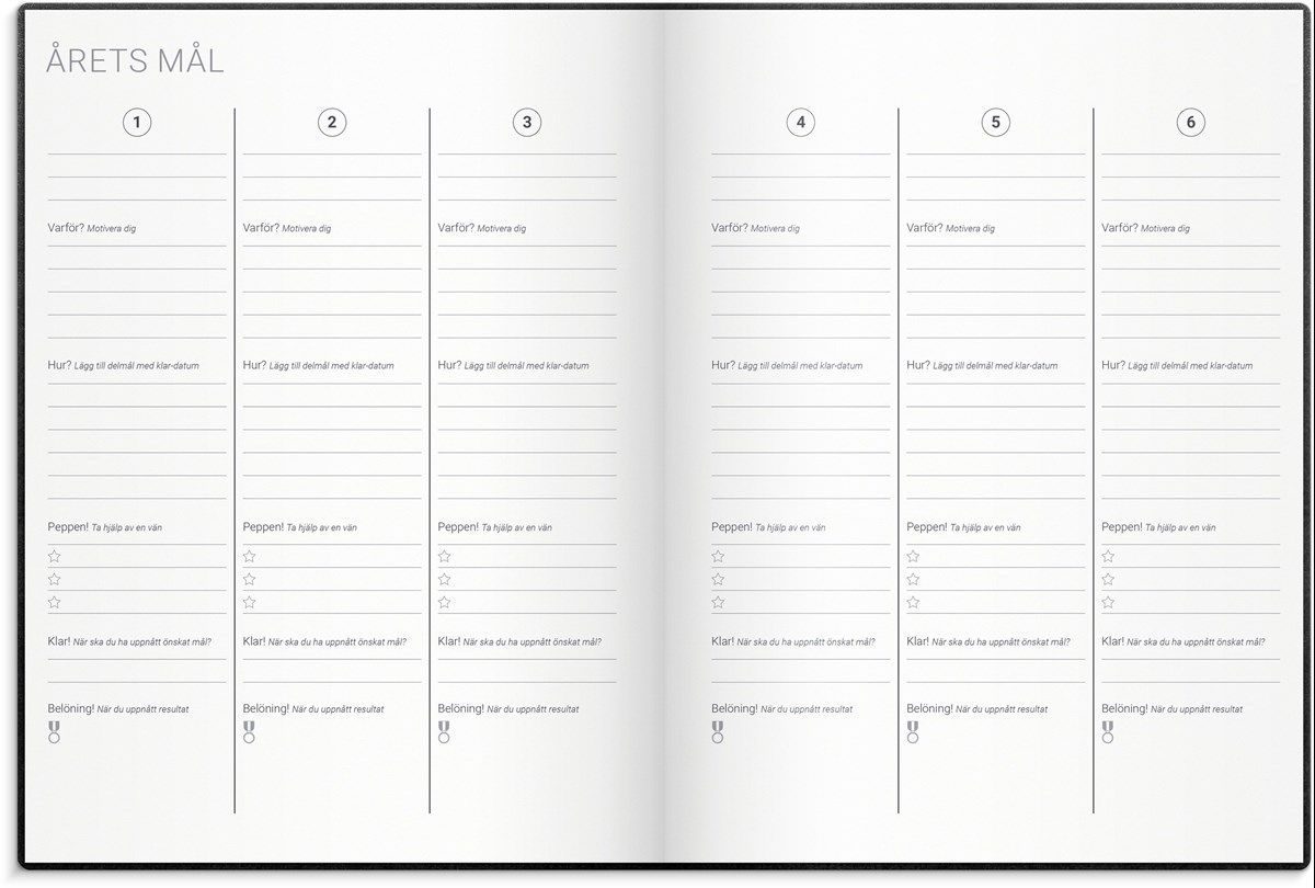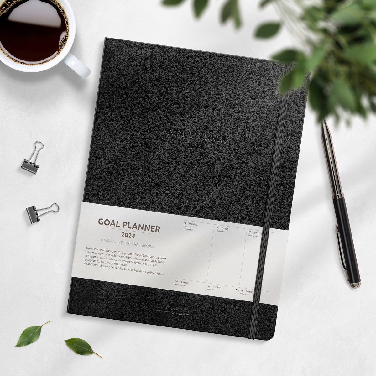 Att sätta upp mål, kämpa och slutligen lyckas är en rejäl boost för självkänslan! Oavsett vad du vill åstadkomma eller förändra är Burdes Goal Planner din optimala stöttepelare längs vägen. Du får hjälp med delmål, reflektioner, belöningar och din dagliga planering, såklart. Kalendern har ett stilrent omslag i svart konstläder med gummiband och märkband.