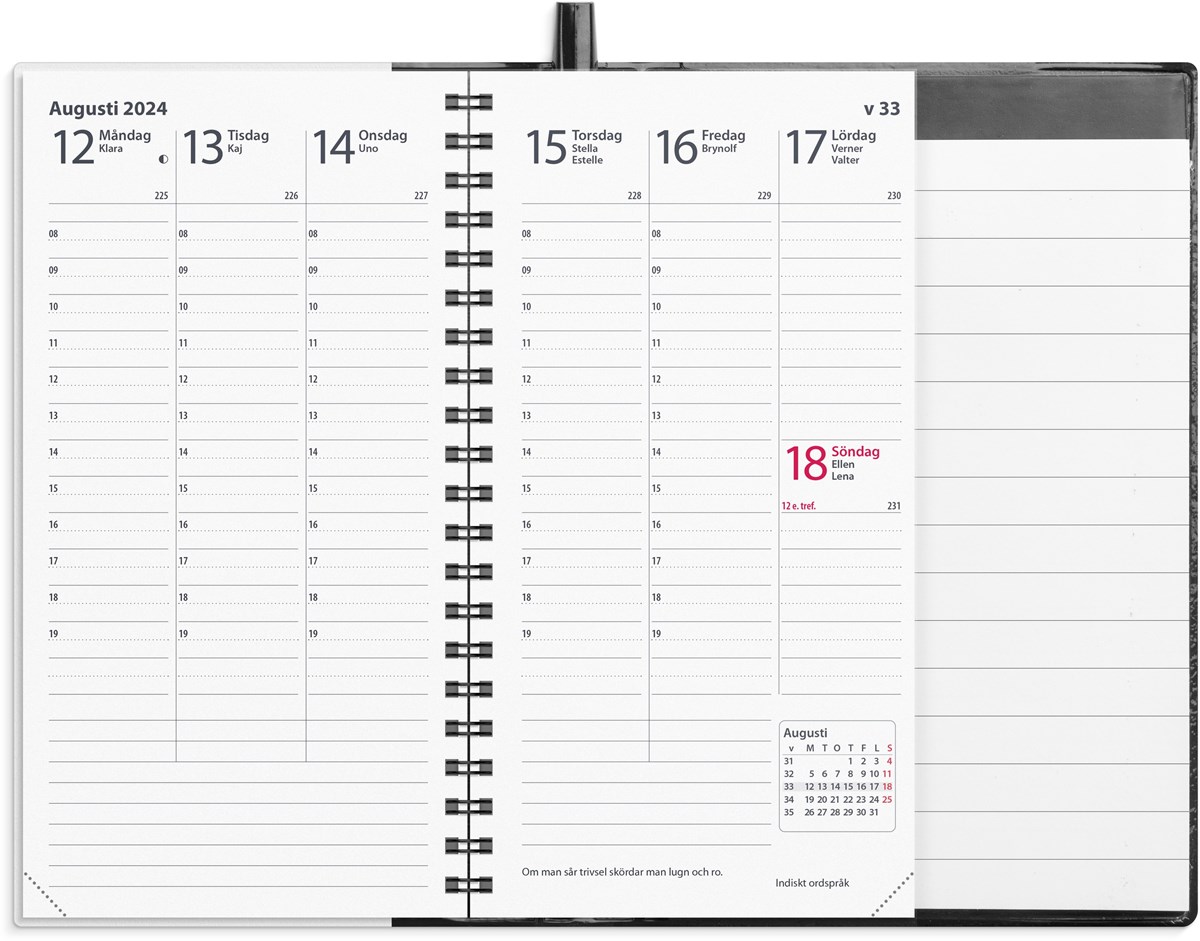 Kalender 2024 från Burde. Format: 88x163 mm. Layout: Stående. Vecka/Uppslag. Timindelning 8-19. Kalendarium: 2023-12-25 - 2025-01-05. Omslag: Plast. Spiralbunden. Innehåll: Årsöversikter, årsplaner. Antal sidor: 128. Miljöinformation: FSC papper.