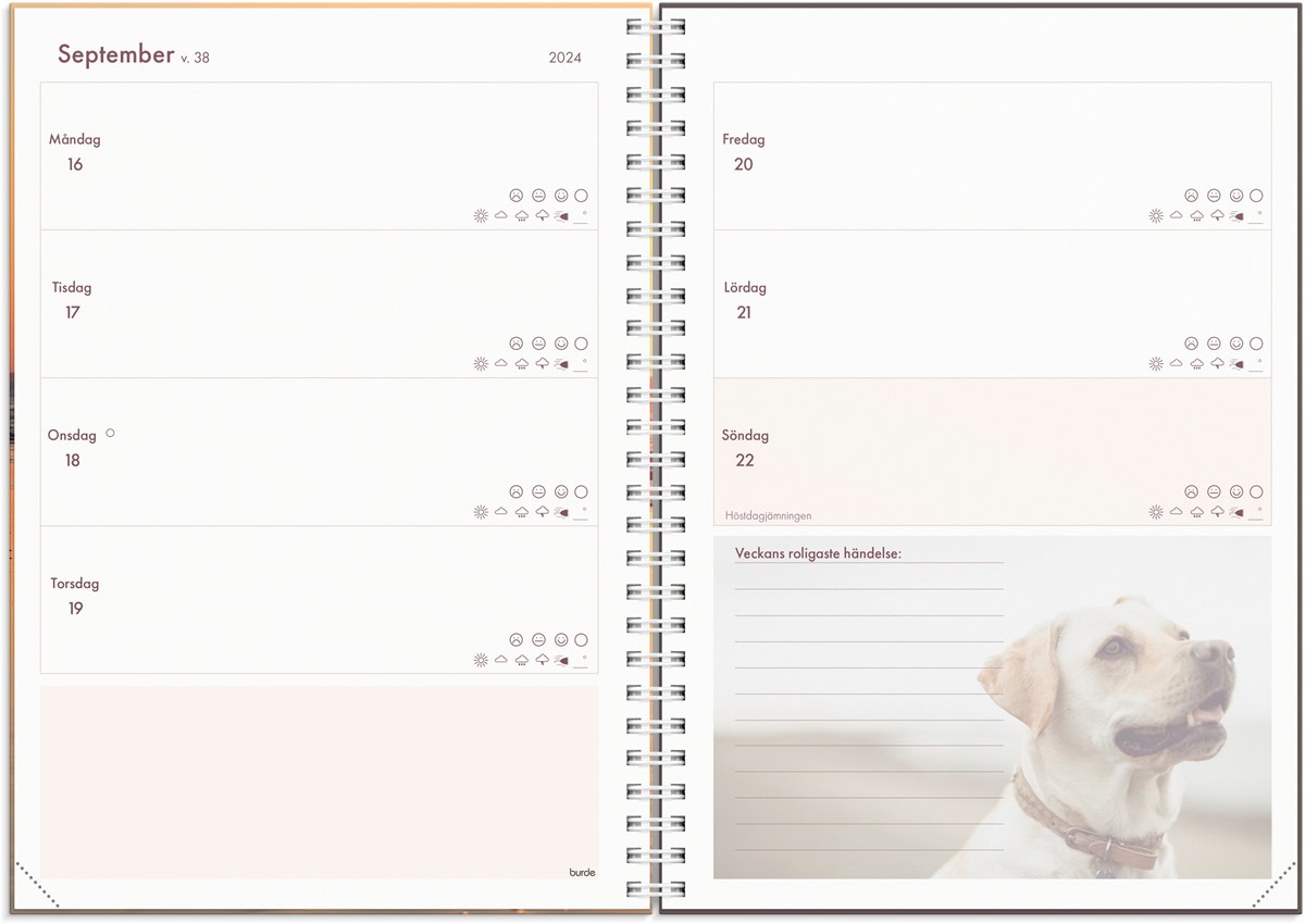 Kalender 2024 från Burde. Format: A5. Layout: Liggande. Vecka/Uppslag. Kalendarium: 2023-12-18 - 2025-01-05. Omslag: Kartong med sammetslen yta. Spiralbunden. Detaljer: Gummiband. Innehåll: Årsöversikter, anteckningssidor. Antal sidor: 160. Miljöinformation: FSC.