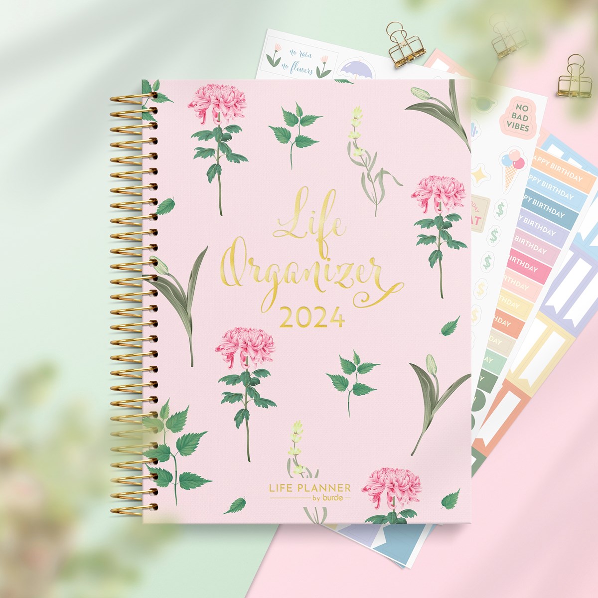 Kalender 2024 från Burde. Format: 163x229 mm. Layout: Stående. Vecka/Uppslag. Kalendarium: 2024-01-01 - 2025-01-05. Omslag: Kartong med struktur. Spiralbunden. Detaljer: Pappersficka. Innehåll: Årsöversikter, årsplan, anteckningssidor, stickersark. Antal sidor: 176. Miljöinformation: FSC papper.