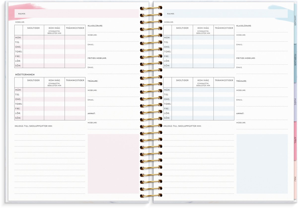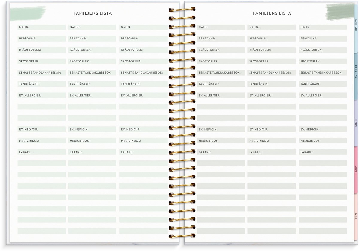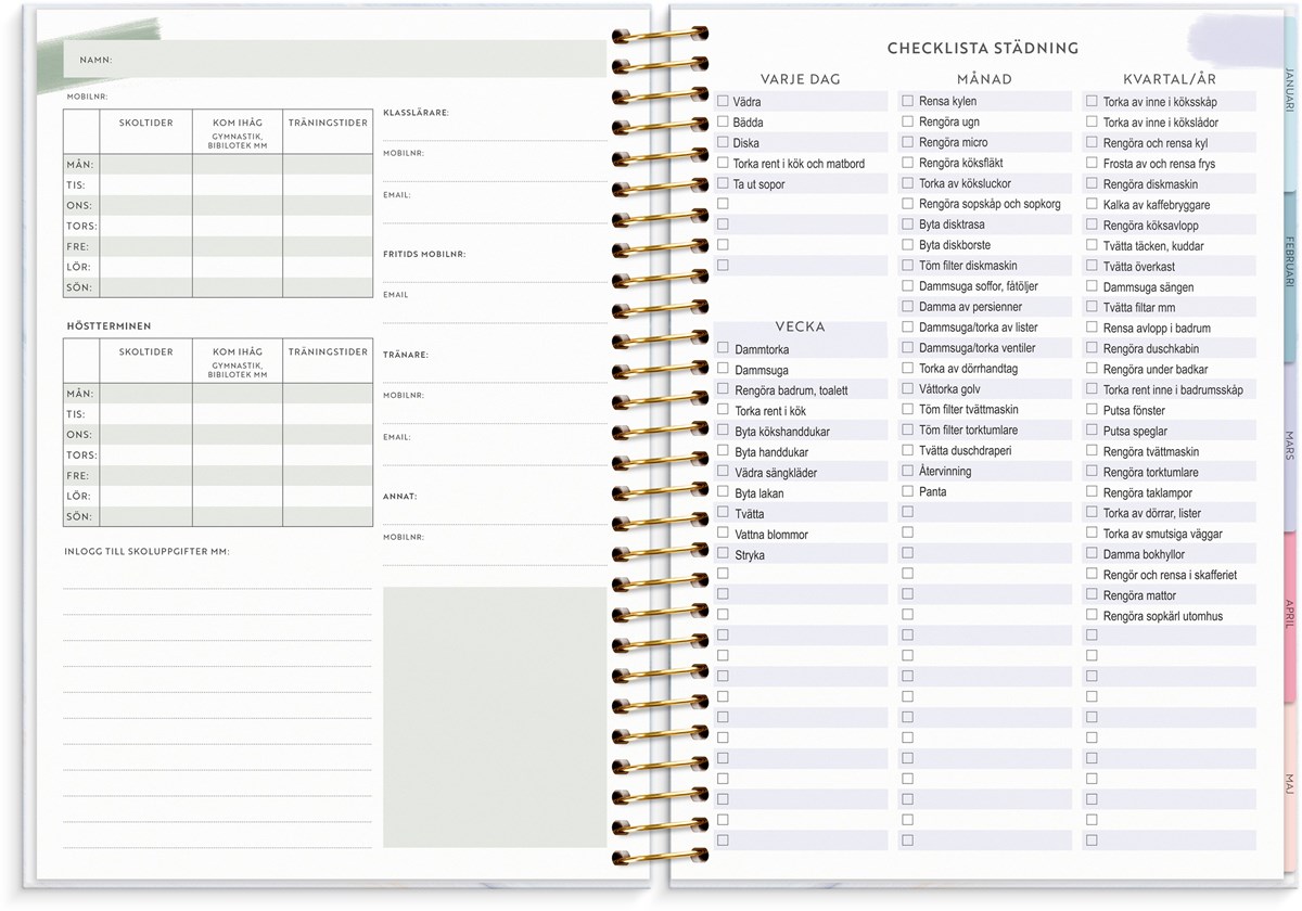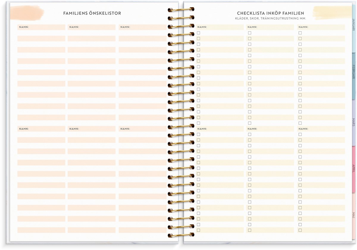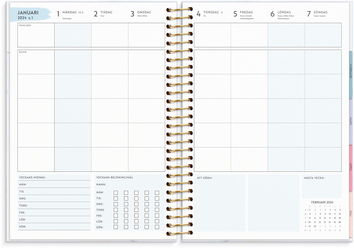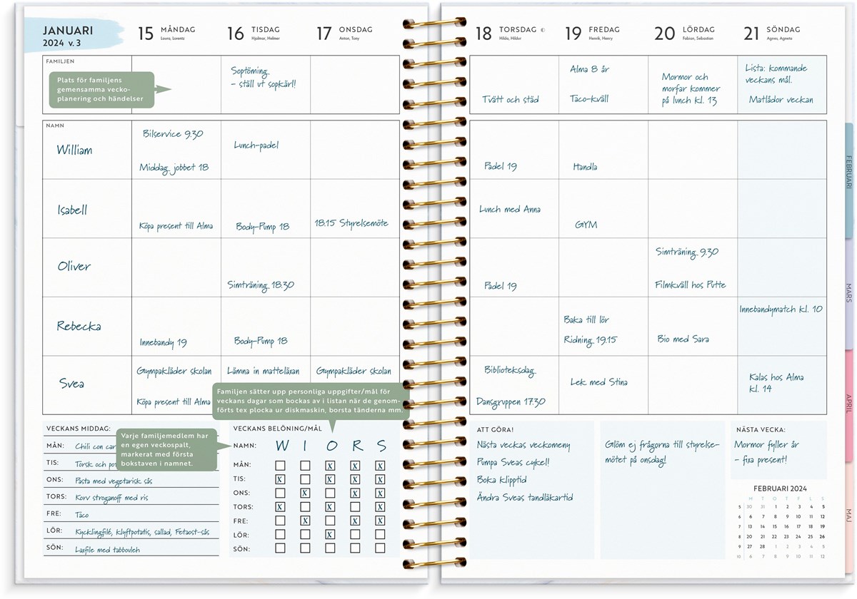 All planering för familjen i en och samma kalender!    Belöningsmodul för att notera framstegen mot veckomål.  Plats för veckans matsedel. I slutet av kalendern finns kom ihåg-, check- och att göra-listor m.m. Stickersarken gör planeringen ännu roligare!
