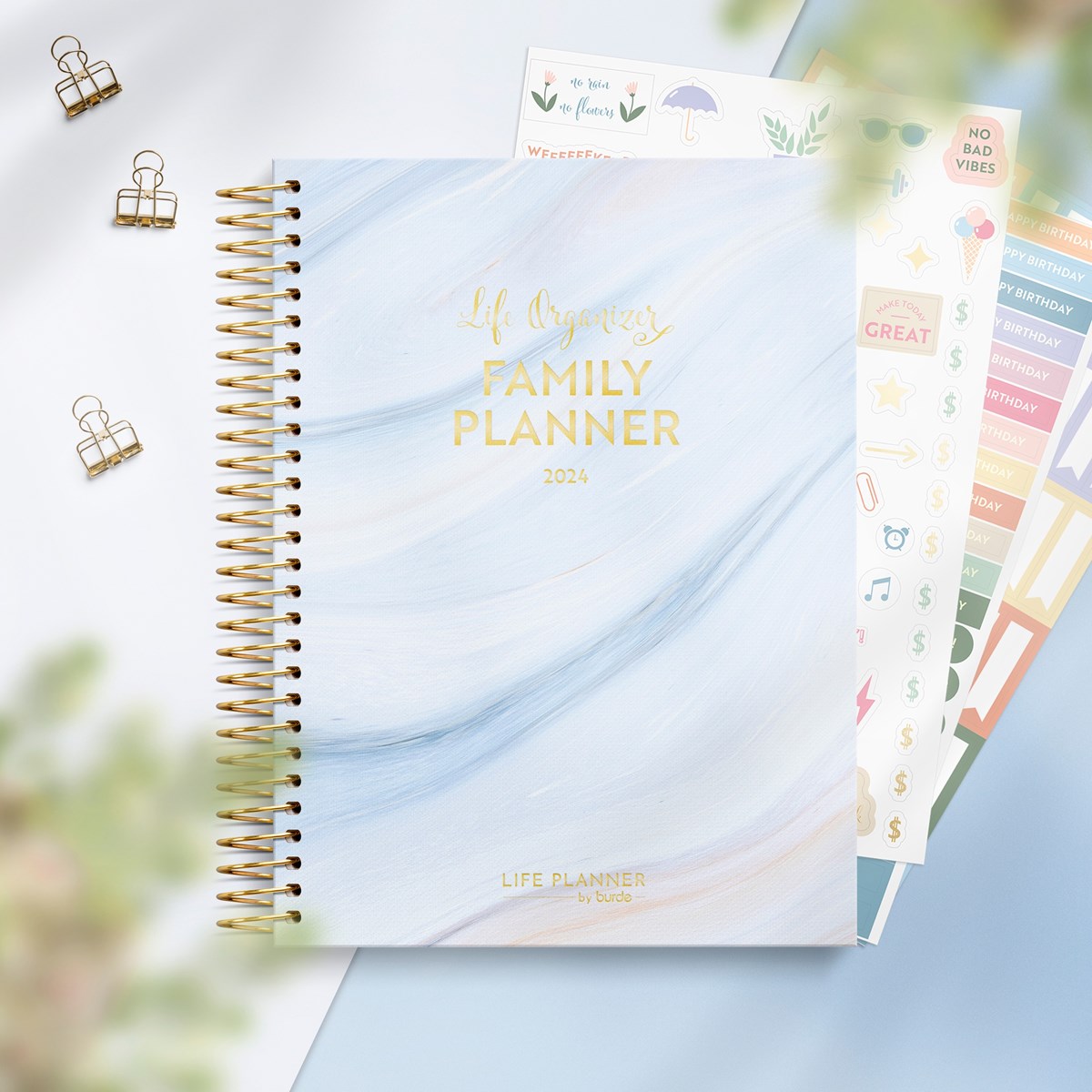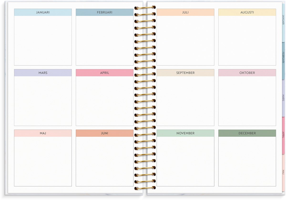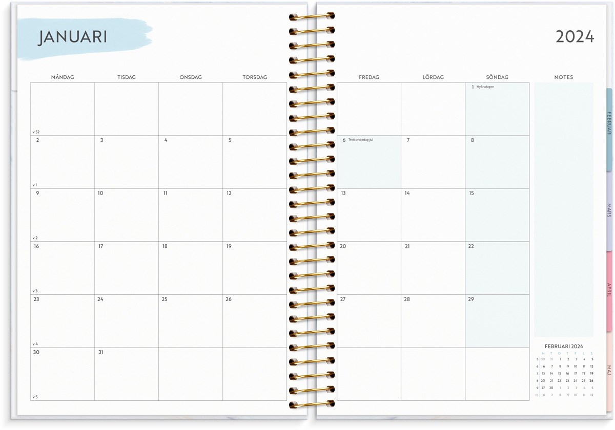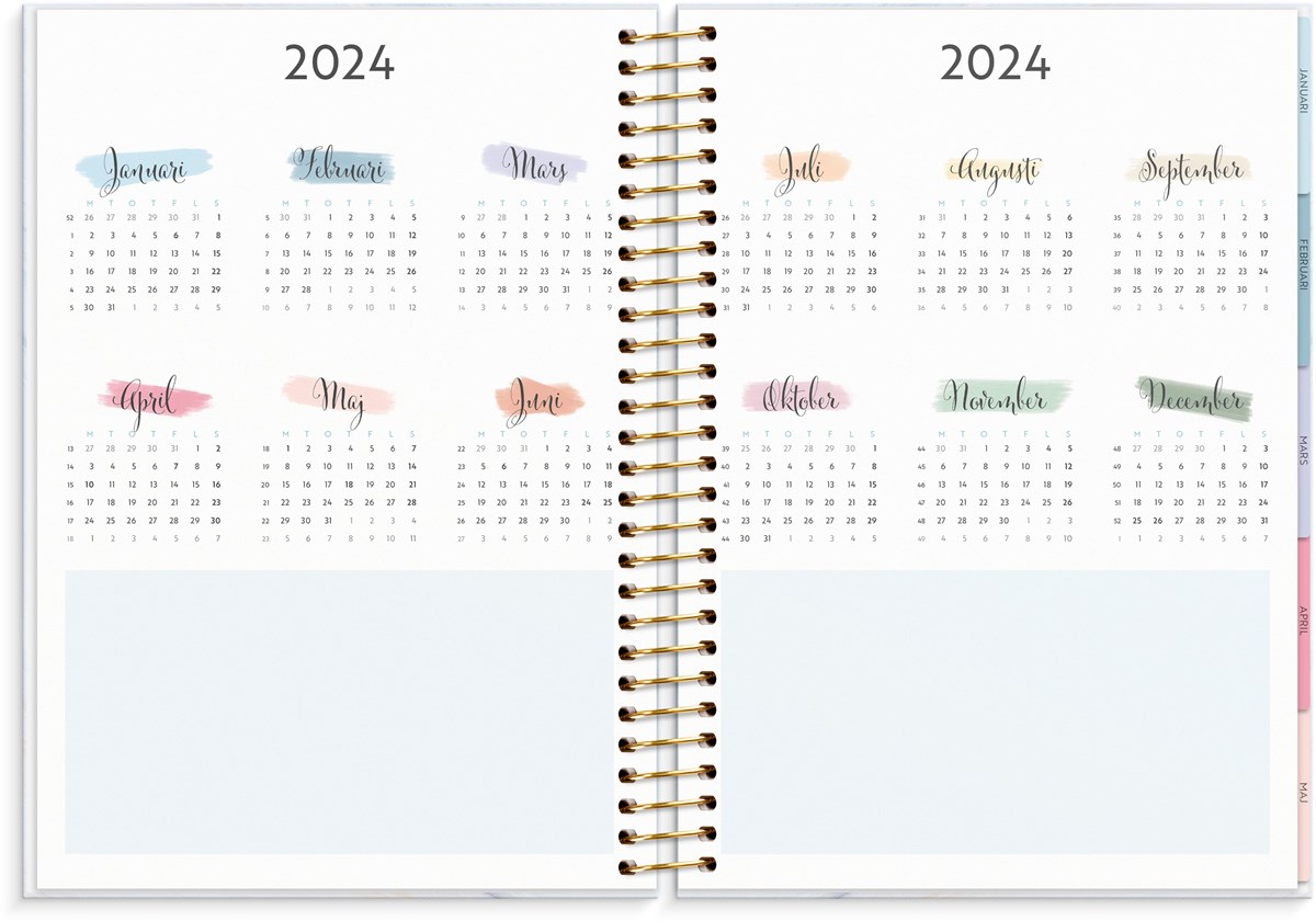 Kalender 2024 från Burde. Format: 163x229 mm. Layout: Vecka/Uppslag. Kalendarium: 2024-01-01 - 2025-01-05. Omslag: Kartong med struktur. Spiralbunden. Detaljer: Pappersficka. Innehåll: Årsöversikter, årsplan, anteckningssidor, stickersark. Antal sidor: 176. Miljöinformation: FSC papper.
