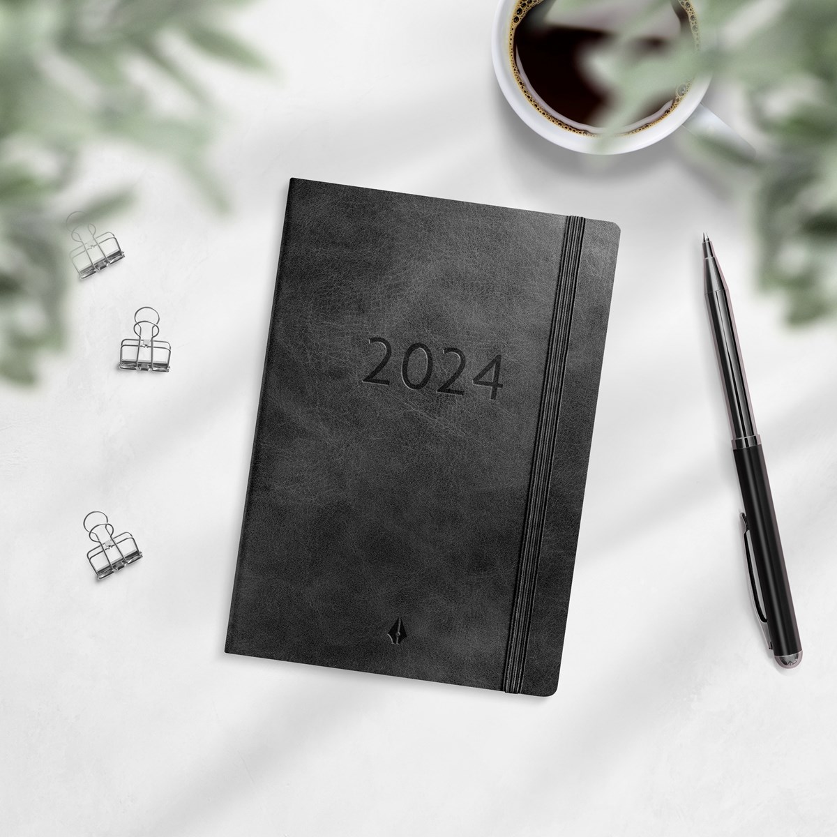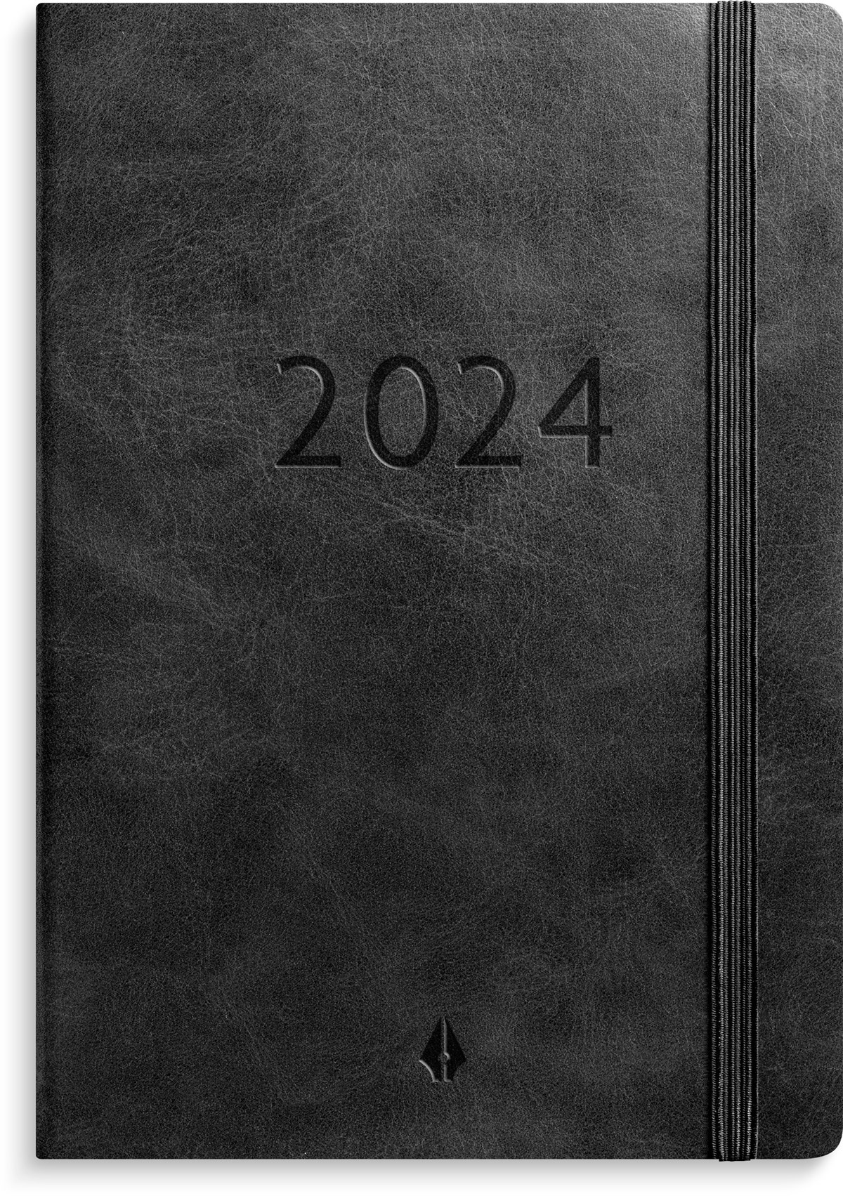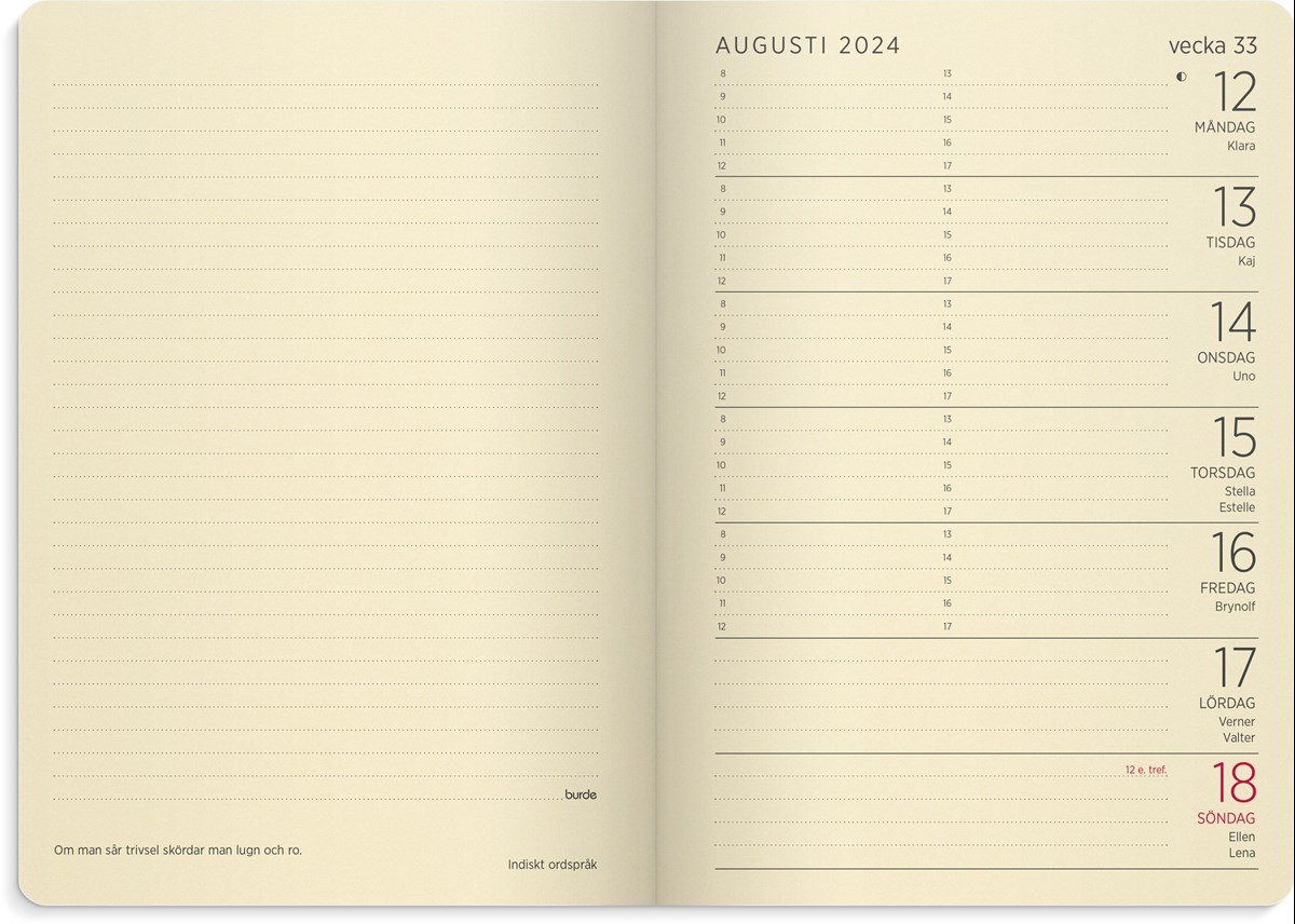 Kalender 2024 från Burde. Format: A6. Layout: Liggande. Vecka/Uppslag. Timindelning 8-17. Kalendarium: 2023-12-11 - 2025-01-05. Omslag: Konstläder. Inbunden. Detaljer: Gummiband. Märkband. Innehåll: Årsöversikter, årsplaner, linjerade vänstersidor, anteckningssidor linjerade, rutade, olinjerade. Antal sidor: 176. Miljöinformation: FSC papper.