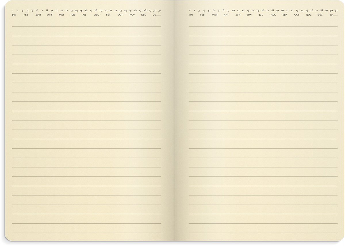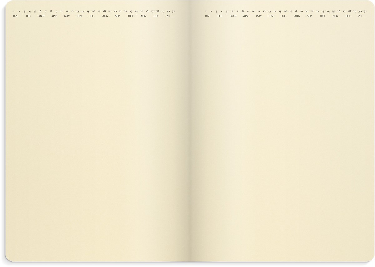 En stilren och exklusiv kalender där fokus ligger på tydlig planering. Inlagan har ett praktiskt uppslag där högersidan har veckoplanering med liggande layout och timindelning 08-17 och vänstersidan är linjerad för anteckningar. I slutet hittar du 48 extra sidor för anteckningar. Pappret är klassiskt cremefärgat.