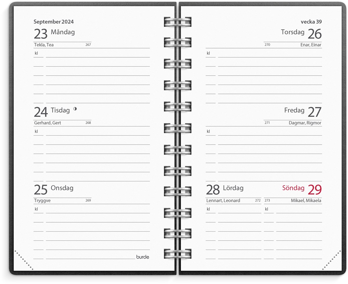 Kalender 2024 från Burde. Format: 63x107 mm. Layout: Liggande. Vecka/Uppslag. Kalendarium: 2023-11-13 - 2025-01-05. Omslag: Återvunnen kartong. Spiralbunden. Innehåll: Årsöversikt, telefonregister. Antal sidor: 160. Miljöinformation: FSC. Omslag i återvunnen kartong. Tillverkad i Småland.