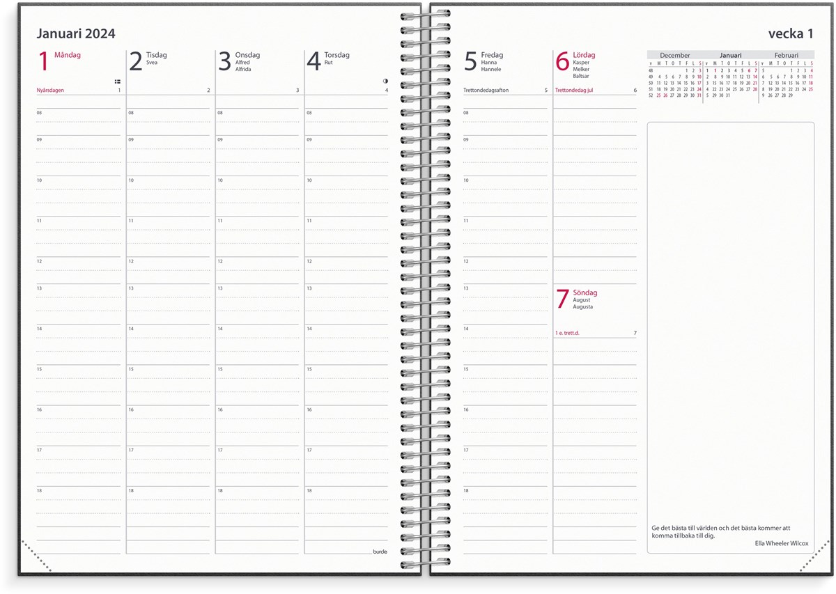Kalender 2024 från Burde. Format: A5. Layout: Stående. Vecka/Uppslag. Timindelning 8-18. Kalendarium: 2023-12-25 - 2025-01-05. Omslag: Kartong. Spiralbunden. Detaljer: Flyttbar linjal. Pappersficka. Innehåll: Årsplaner, Utvikbar projektplan. Antal sidor: 240. Miljöinformation: FSC.