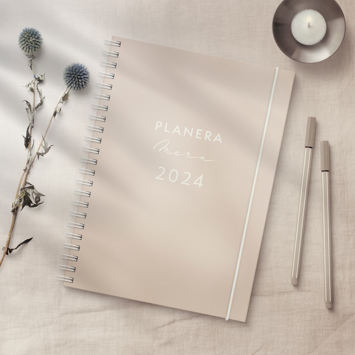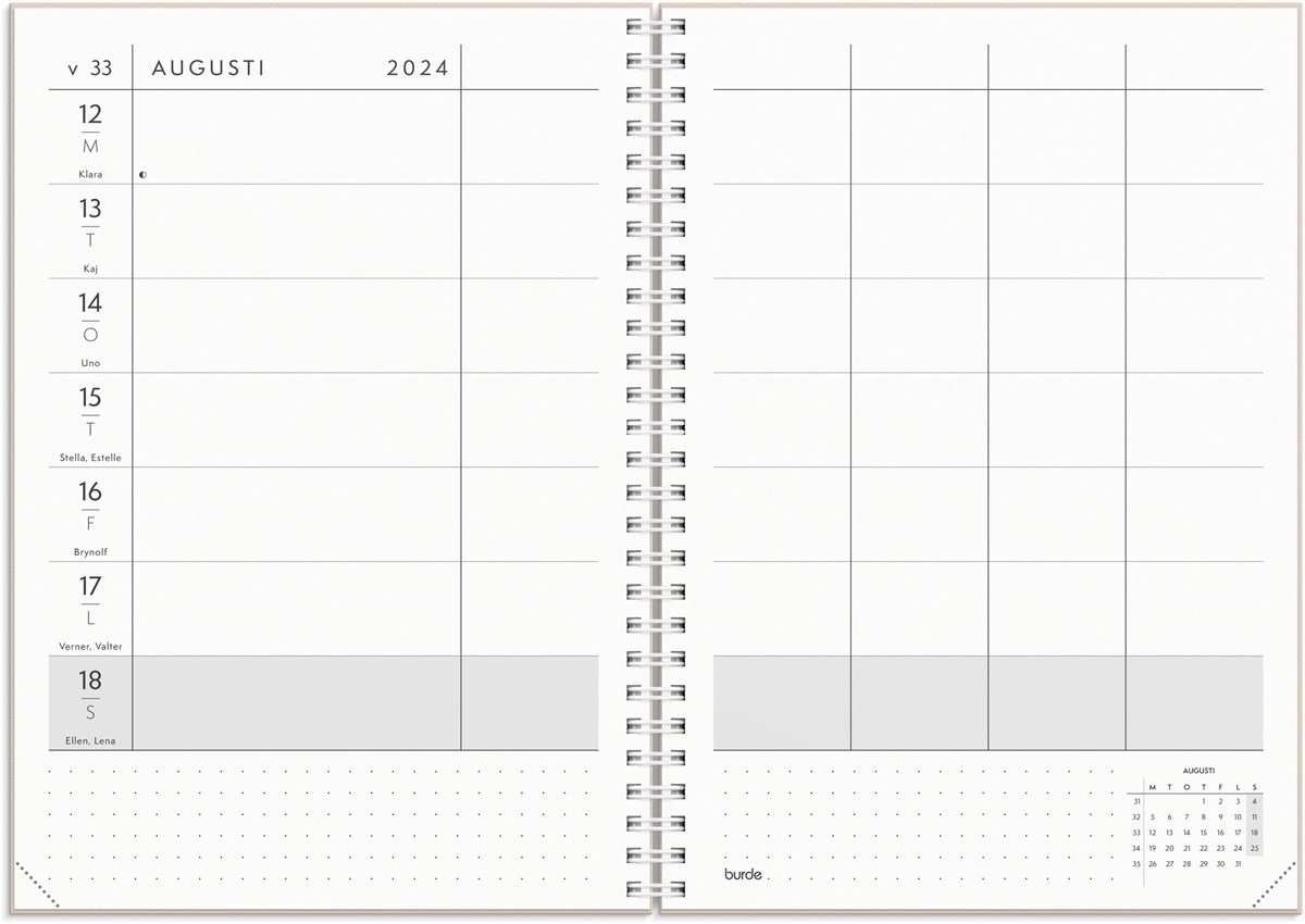 Kalender 2024 från Burde. Format: A5. Layout: Liggande. Vecka/Uppslag. Kalendarium: 2023-12-11 - 2025-01-05. Omslag: Kartong med struktur. Spiralbunden. Detaljer: Gummiband. Pappersficka. Innehåll: Årsöversikt, årsplaner. Antal sidor: 160. Miljöinformation: FSC.