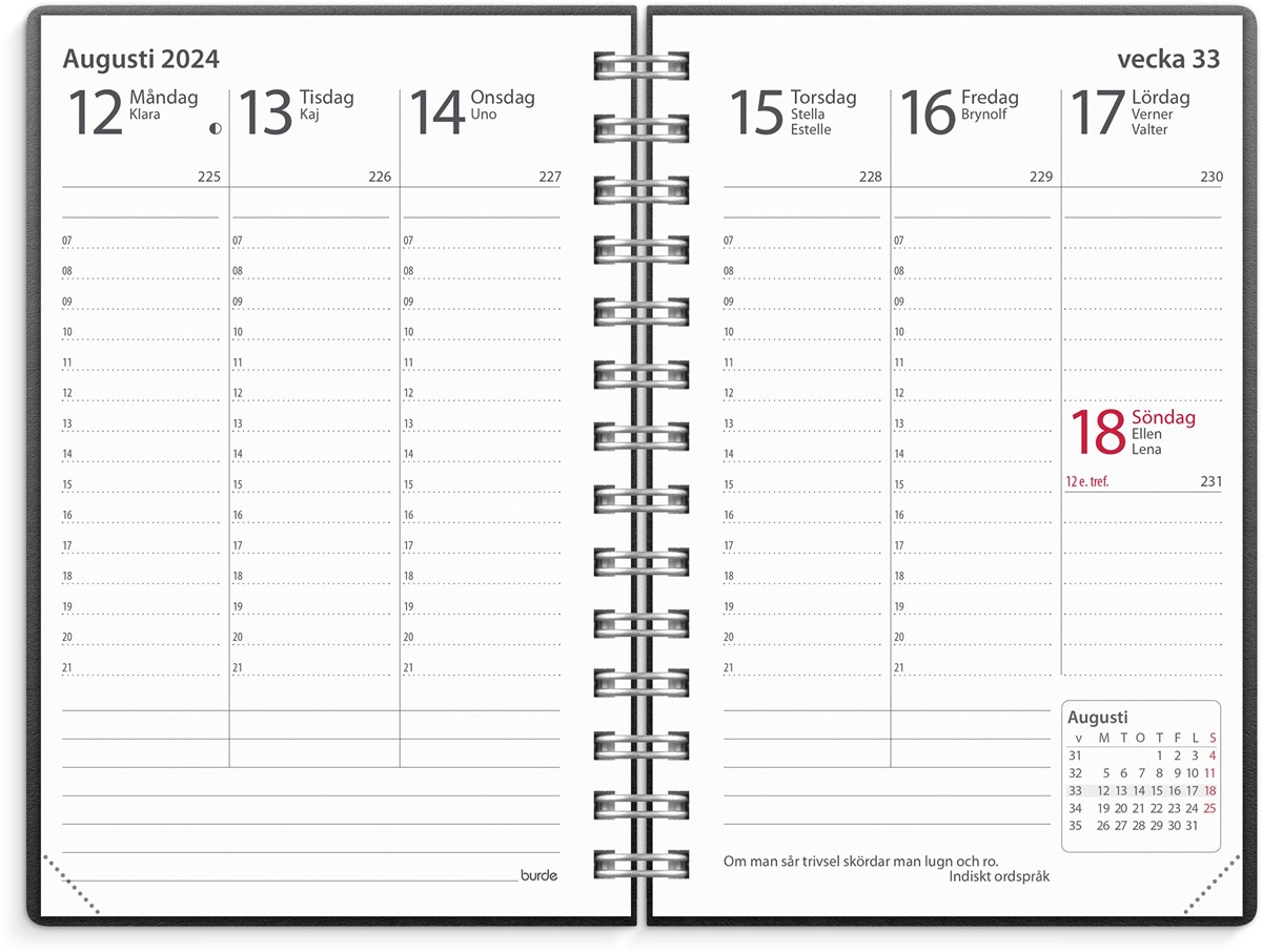 Kalender 2024 från Burde. Format: 83x127 mm. Layout: Stående. Vecka/Uppslag. Timindelning 7-21. Kalendarium: 2023-12-11 - 2025-01-05. Omslag: Återvunnen kartong. Spiralbunden. Innehåll: Årsöversikter, årsplaner, telefonregister. Antal sidor: 144. Miljöinformation: FSC. Omslag i återvunnen kartong. Tillverkad i Småland.