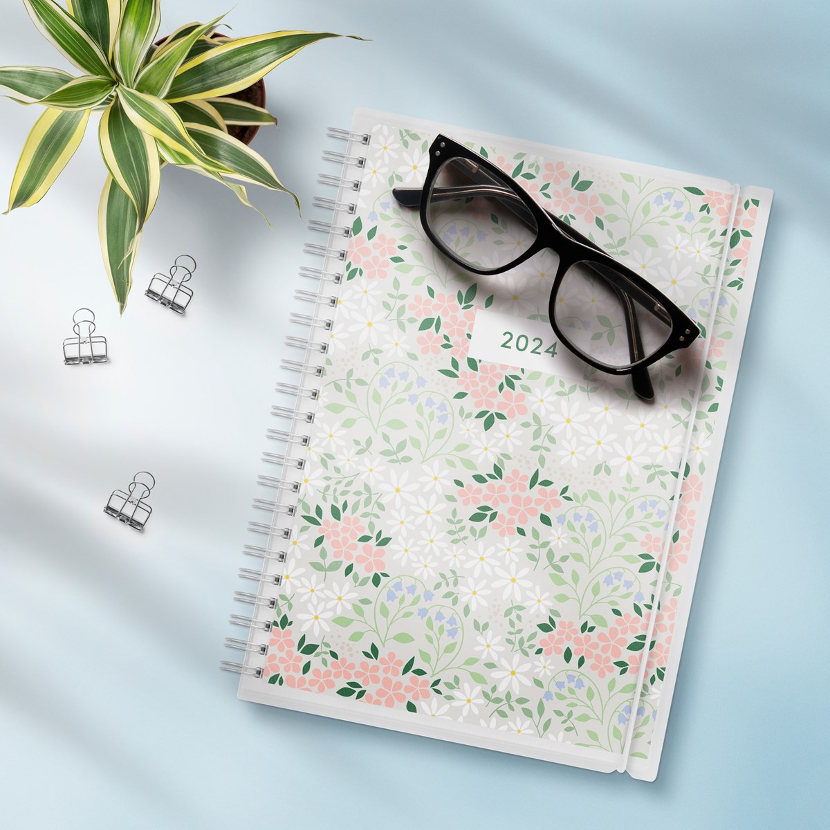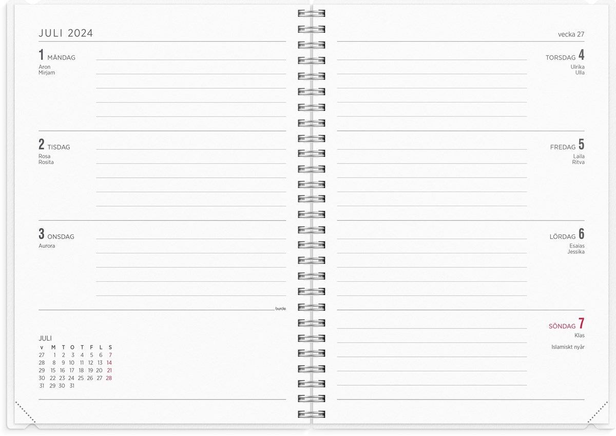 Framsidan kan du ändra året om, kalendern innehåller fyra motiv som du lätt kan byta mellan eller varför inte skapa ett eget? För att detta ska vara möjligt och fortsatt vara ett praktiskt omslag så är omslaget gjort i återvunnen plast. En layout där fokus ligger på tydlig planering. Inlagan passar dig som har mycket på gång, oavsett veckodag. Kalendern är enkel och tydlig med lika mycket utrymme för både vardag och helg.