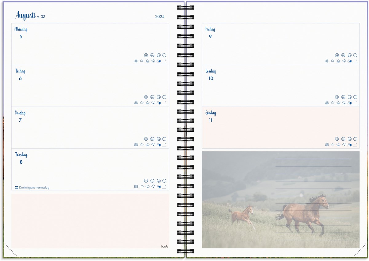 Kalender 2024 från Burde. Format: A5. Layout: Liggande. Vecka/Uppslag. Kalendarium: 2023-12-18 - 2025-01-05. Omslag: Kartong med sammetslen yta. Spiralbunden. Detaljer: Gummiband. Innehåll: Årsöversikter, anteckningssidor. Antal sidor: 160. Miljöinformation: FSC.