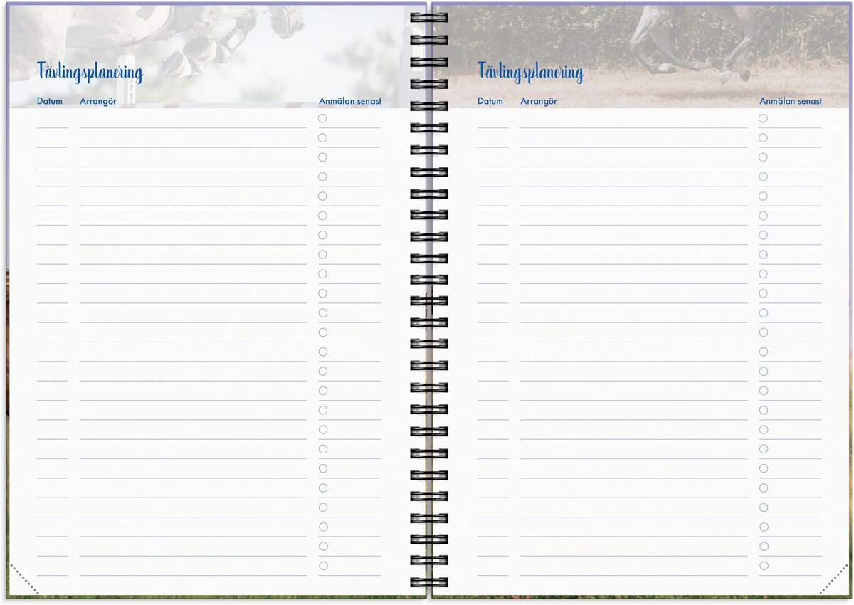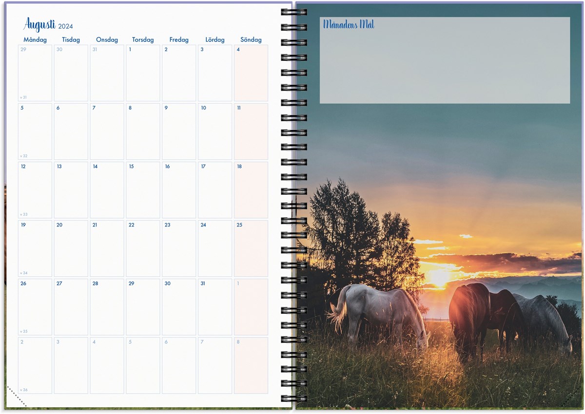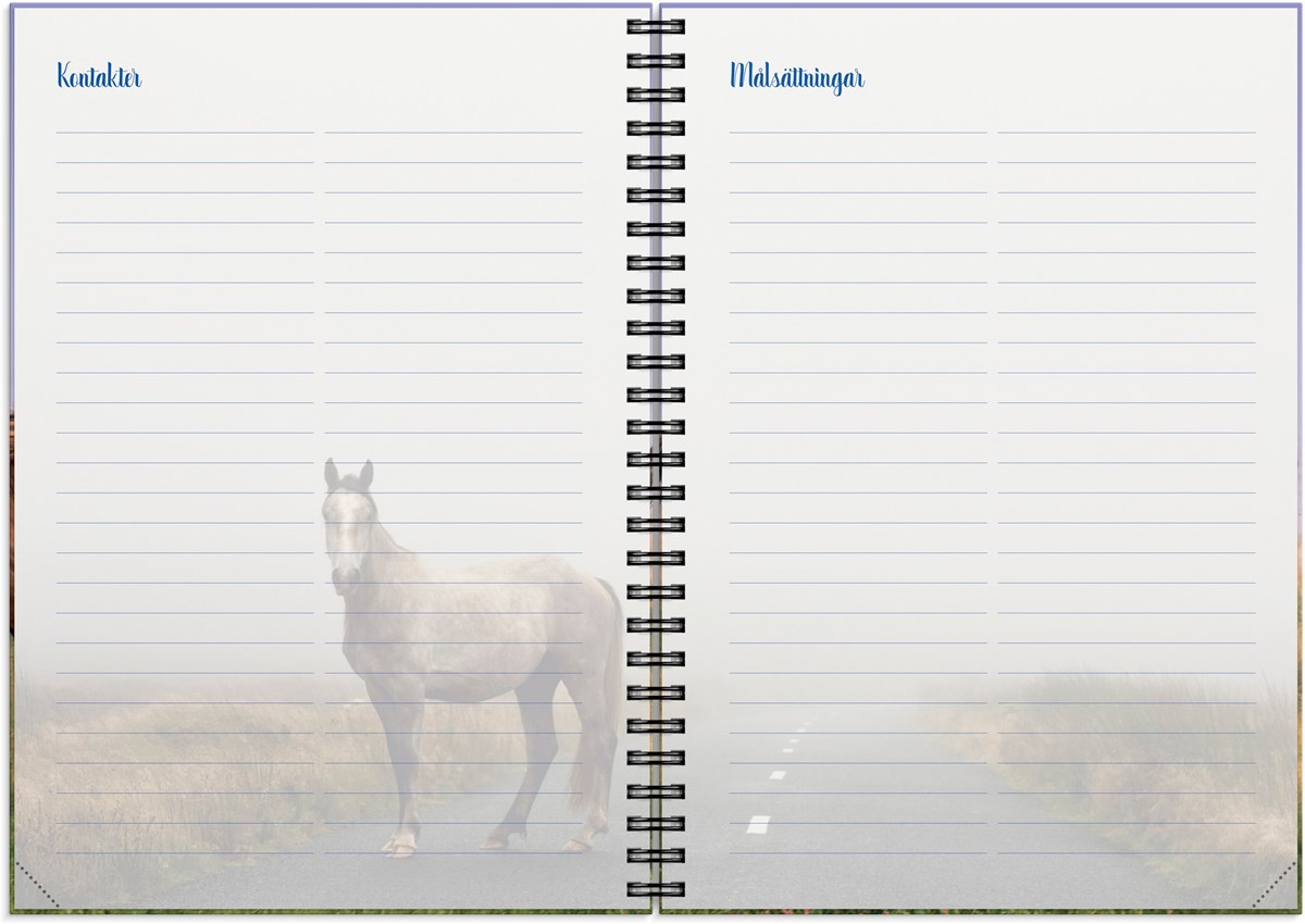 För dig som älskar hästar är en stallkalender det ultimata planeringsverktyget. Här får du utrymme att anteckna viktig information om dina hästar, kontaktuppgifter till hovslagare och veterinär, planera in tävlingar, utvärdera tävlingar och sätta mål för året. Vackra hästbilder och lekfull design gör planeringen rolig och hjälper dig att hitta tid för din passion i livet. Veckoplanering och månadsöversikt ger bra plats för kom ihåg och att göra upp planer.