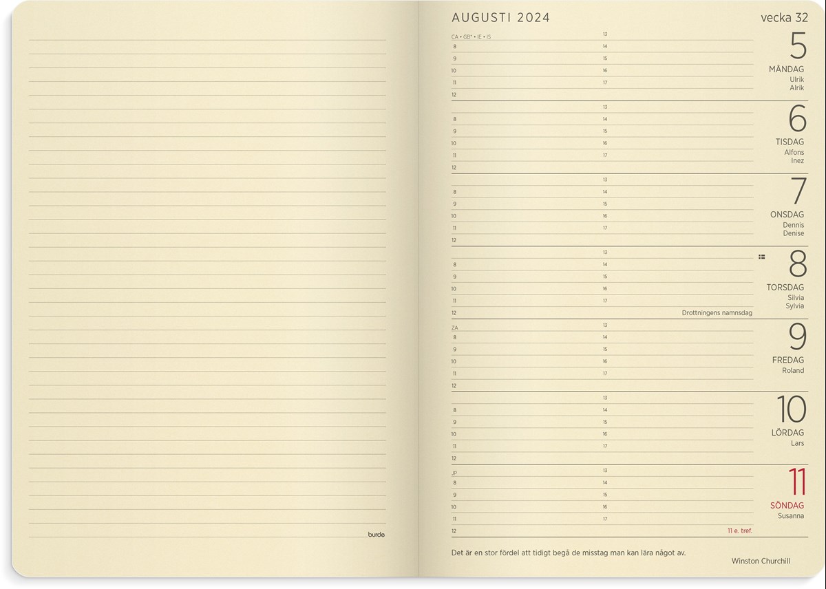 En stilren och exklusiv kalender där fokus ligger på tydlig veckoplanering. En klassisk kalender med cremefärgat papper och med en vecka per uppslag, där vänstersidan har linjerade sidor för anteckningar och högersidan timindelning 08-17. I slutet hittar du 64 extra sidor för anteckningar och en lättöverskådlig årsplanering. Enkelt och tydligt med fokus på det viktigaste!