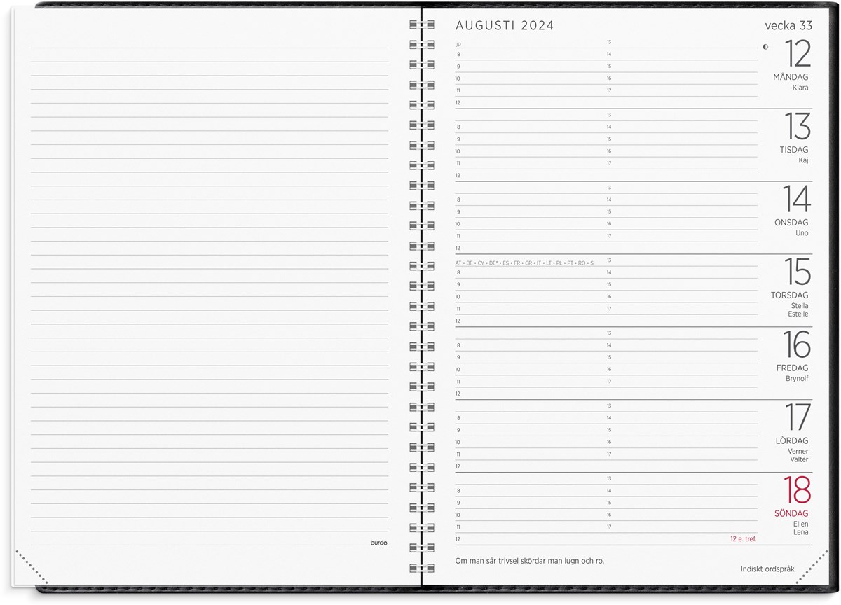 Kalender 2024 från Burde. Format: A5. Layout: Liggande. Vecka/Uppslag. Timindelning 8-17. Kalendarium: 2023-12-25 - 2025-01-05. Omslag: Konstläder. Spiralbunden. Innehåll: Årsöversikter, årsplaner, linjerade vänstersidor, internationella helgdagar, löst telefonblad. Antal sidor: 112. Miljöinformation: FSC.