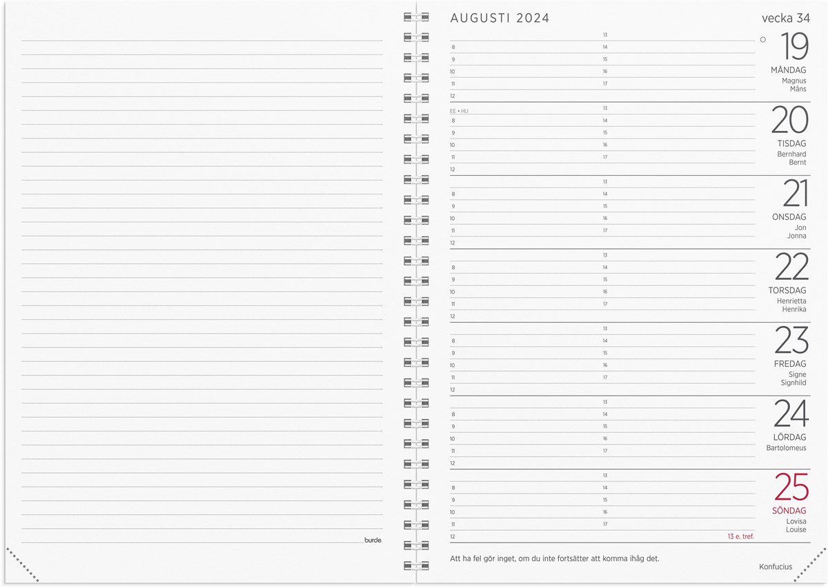 Kalender med löst omslag med fyra kreditkortsfickor, en större ficka och pennhållare. En klassisk kalender med en vecka per uppslag, där vänstersidan har linjerade sidor för anteckningar och högersidan timindelning 08-17. I slutet hittar du extra sidor för anteckningar och en lättöverskådlig årsplanering. Enkelt och tydligt med fokus på det viktigaste!