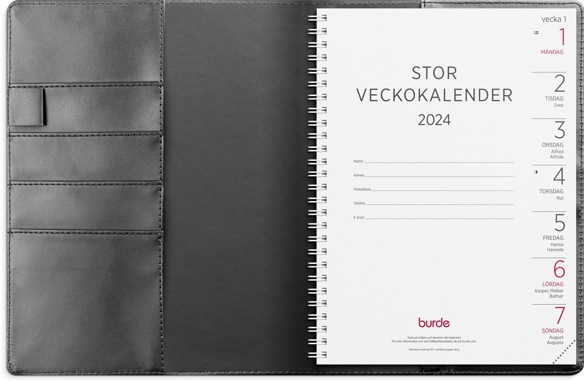 Klassiskt konstläderomslag som skyddar din kalender Extra anteckningssidor Veckouppslag med både planering och plats för anteckningar