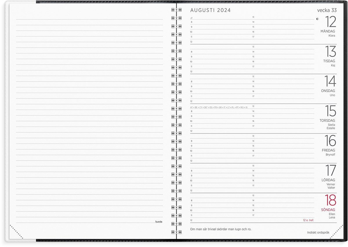Kalender 2024 från Burde. Format: A5. Layout: Liggande. Vecka/Uppslag. Timindelning 8-17. Kalendarium: 2023-12-25 - 2025-01-05. Omslag: Plast. Spiralbunden. Innehåll: Årsöversikter, årsplaner, linjerade vänstersidor, internationella helgdagar, löst telefonblad. Antal sidor: 112. Miljöinformation: FSC.