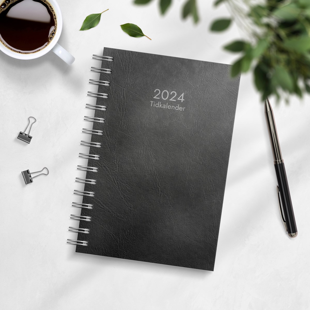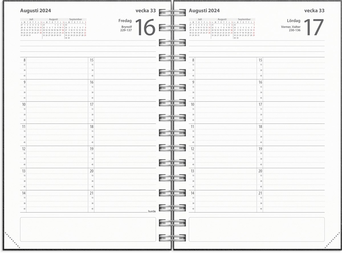 Kalender 2024 från Burde. Format: 135x205 mm. Layout: Dag/Sida. Kvartsindelning 8-22. Kalendarium: 2024-01-01 - 2024-12-31. Omslag: Kartong. Spiralbunden. Innehåll: Årsplaner, urstansat månadsregister. Antal sidor: 400. Miljöinformation: FSC.