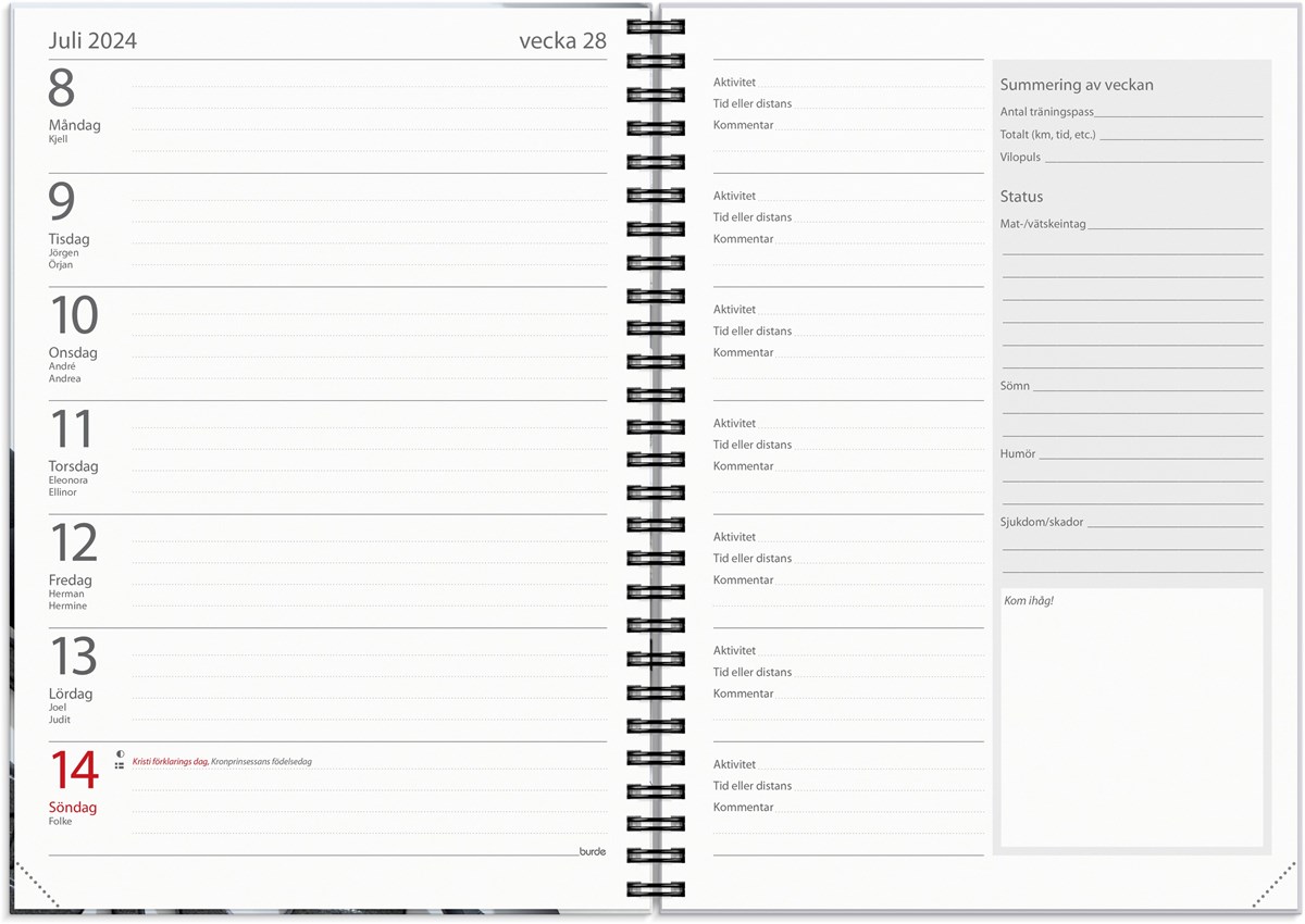 Kalender 2024 från Burde. Format: A5. Layout: Liggande. Vecka/Uppslag. Kalendarium: 2023-12-25 - 2025-01-05. Omslag: Kartong med sammetslen yta. Spiralbunden. Detaljer: Gummiband. Pappersficka. Innehåll: Årsplaner. Antal sidor: 160. Miljöinformation: FSC.
